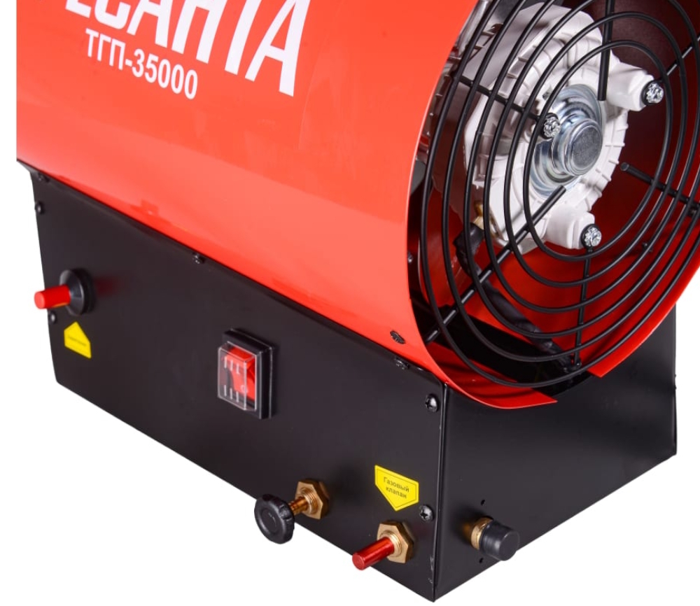 Тепловая газовая пушка РЕСАНТА ТГП-35000 – воздухонагреватель, работающий на сжиженном газовом топливе. Топливо необходимо для получения горячей атмосферы в камере сгорания, а электроэнергия, подводимая к устройству, необходима для питания вентилятора, нагнетающего воздух, и для функционирования автоматики. Газовые пушки прямого нагрева являются простой и надежной конструкцией без дымохода, но горячий воздух и продукты сгорания из устройства поступают в помещение. Одно из главных преимуществ теплопушки – простота применения.