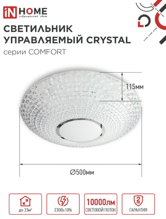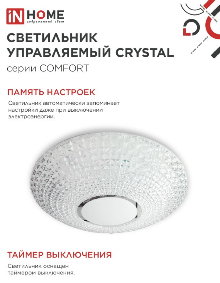 Для создания комфортной атмосферы в помещении существует множество различных решений. Например, светильник потолочный IN HOME Comfort Crystal светодиодный. Он предназначен для общего освещения.