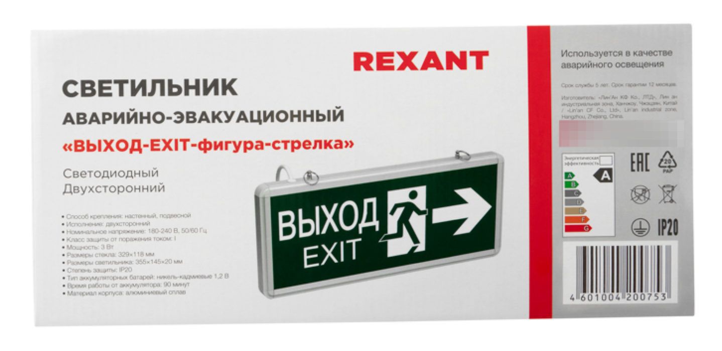 Аварийный светильник REXANT ВЫХОД-EXIT, обеспечивает безопасность и эвакуацию людей при чрезвычайных ситуациях. Он предназначен для подсветки помещений, мест выхода, указывает направление движения.