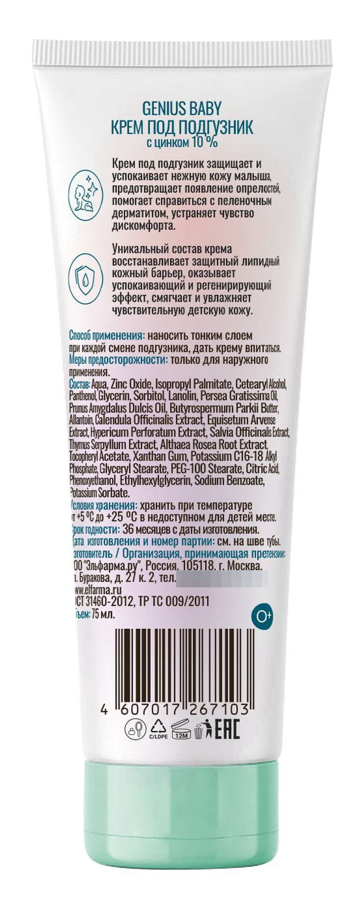 Цинк в концентрации 10% образует защитный слой, уменьшает покраснение и опрелости. Гипоаллергенно.