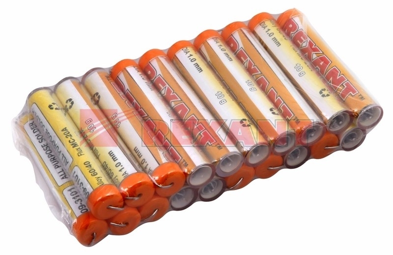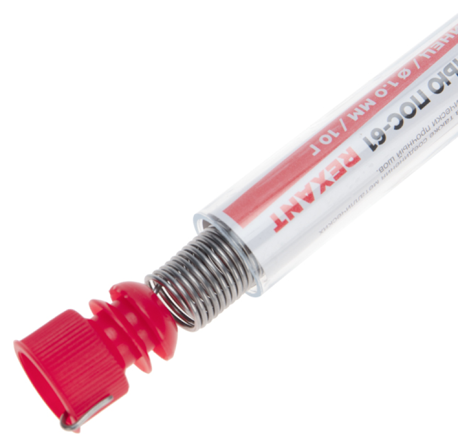 Припой с канифолью REXANT представляет собой проволоку (диаметром 1 мм) из сплава олова (61%) и свинца (39%). Используется в пайке для соединения деталей между собой и позволяет создать герметичный, механически прочный (устойчивый) шов. Нагреваясь до температуры плавления (183…188 °С) припой: расплавляется, смачивает спаиваемый металл и, растекаясь по нему — заполняет место между соединяемыми деталями.