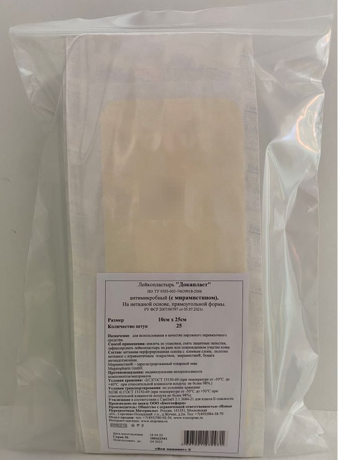 Всё заживёт. Пластырь антимикробный ДокаПласт стерильный с мирамистином белый на нетканой основе 10х25см в упаковке 25шт. / лейкопластырь бактерицидный