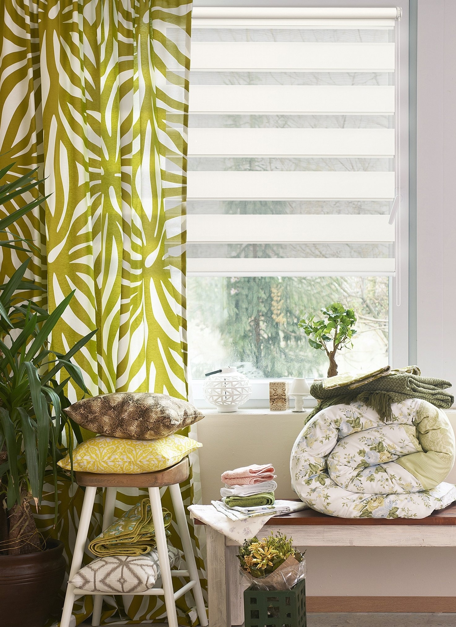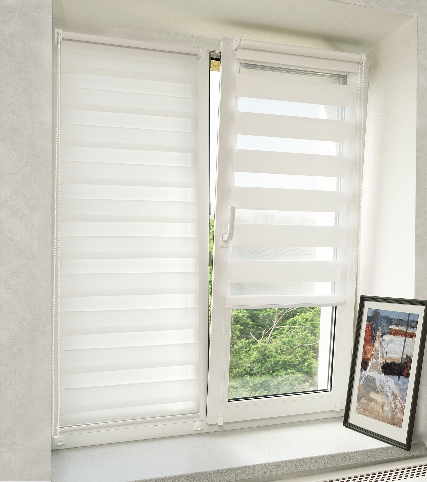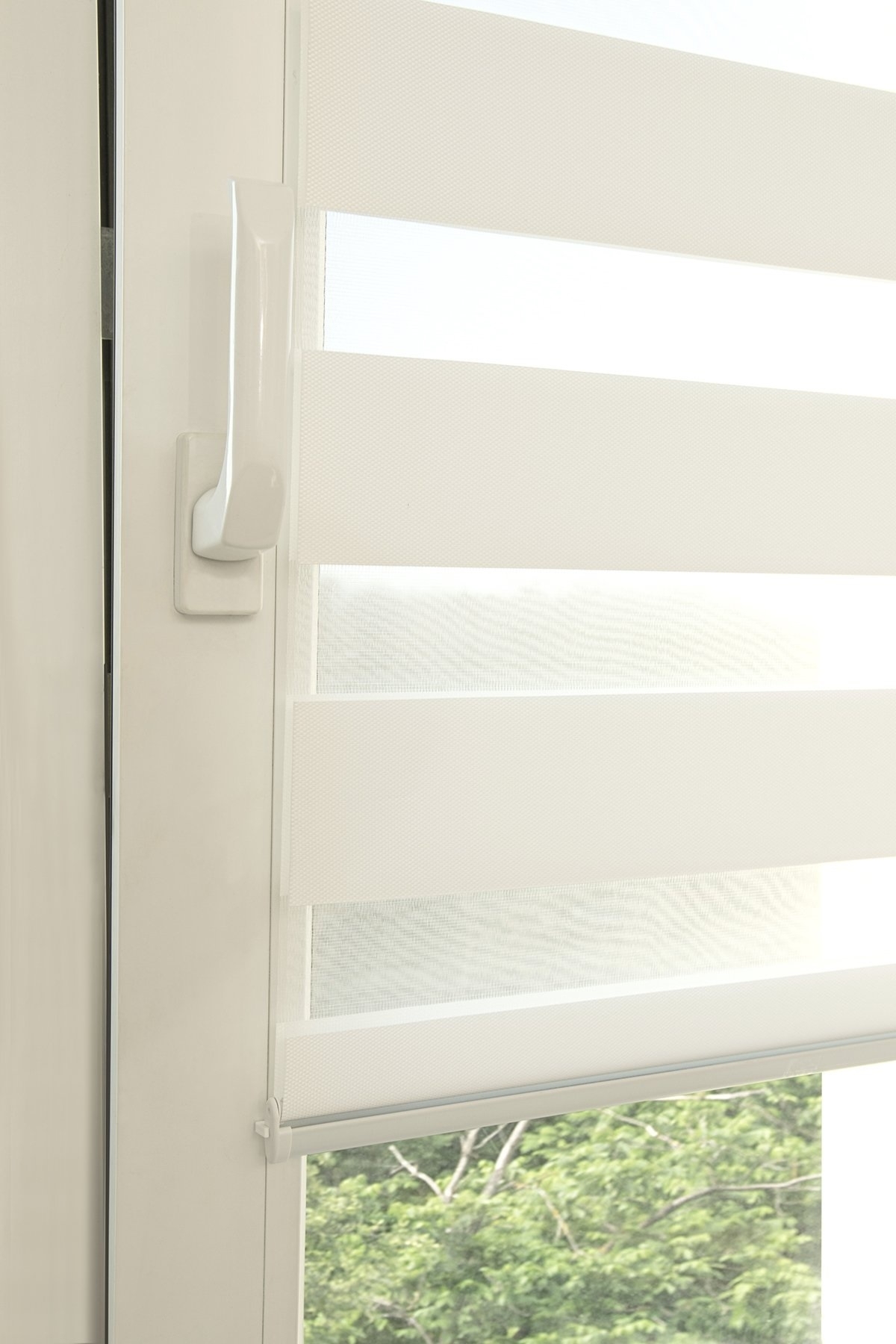Шторы день-ночь предназначены для ручной корректировки освещения в комнате. Они изготовлены из полосок ткани, перемежающихся вставками сеточки. Утром Вы можете передвинуть регулятор цепочки и закрыть шторы полностью, чтобы солнечные лучи не били в глаза. Вечером же шторы открываются настолько, чтобы мягко заливать закатным светом помещение.