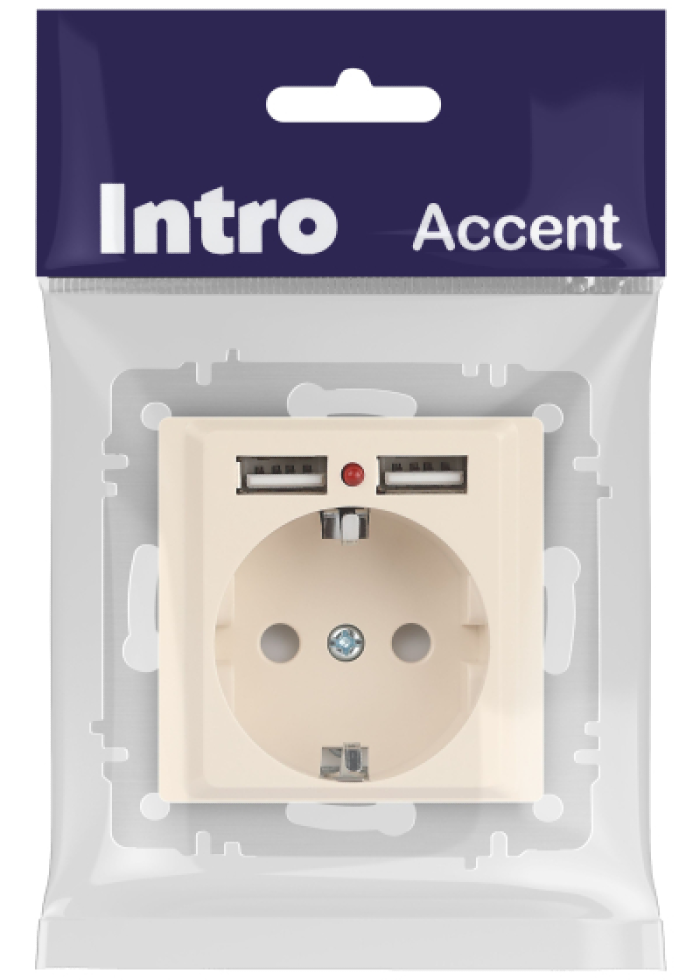 Розетка с USB с заземлением со шторками серии Intro Accent скрытой установки механизм цвет слоновая кость 6-410-02. Номинальные характеристики 16А 250В / 2,1А 5В. Выполнена из негорючего термопласта. Монтаж в подрозетник производится и на лапки, и на винты.