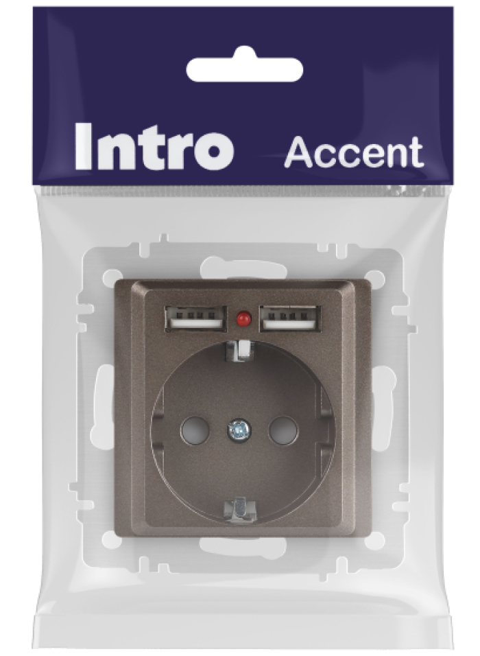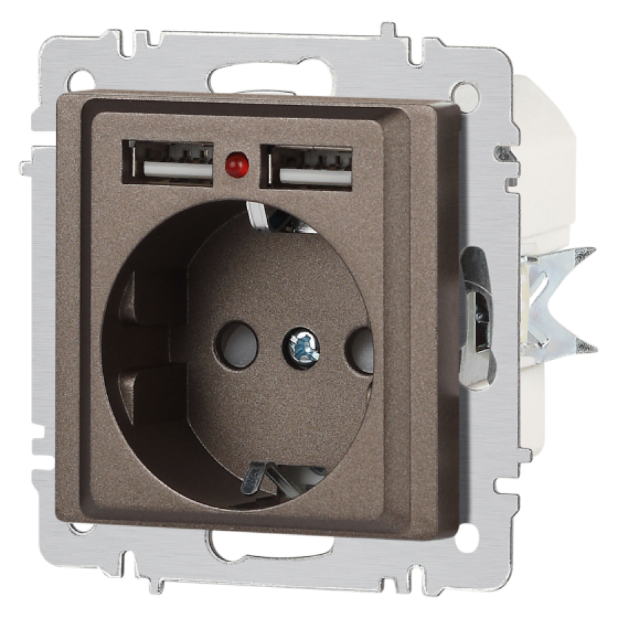 Розетка с USB с заземлением со шторками серии Intro Accent скрытой установки механизм цвет бронза 6-410-08. Номинальные характеристики 16А 250В / 2,1А 5В. Выполнена из негорючего термопласта. Монтаж в подрозетник производится и на лапки, и на винты.