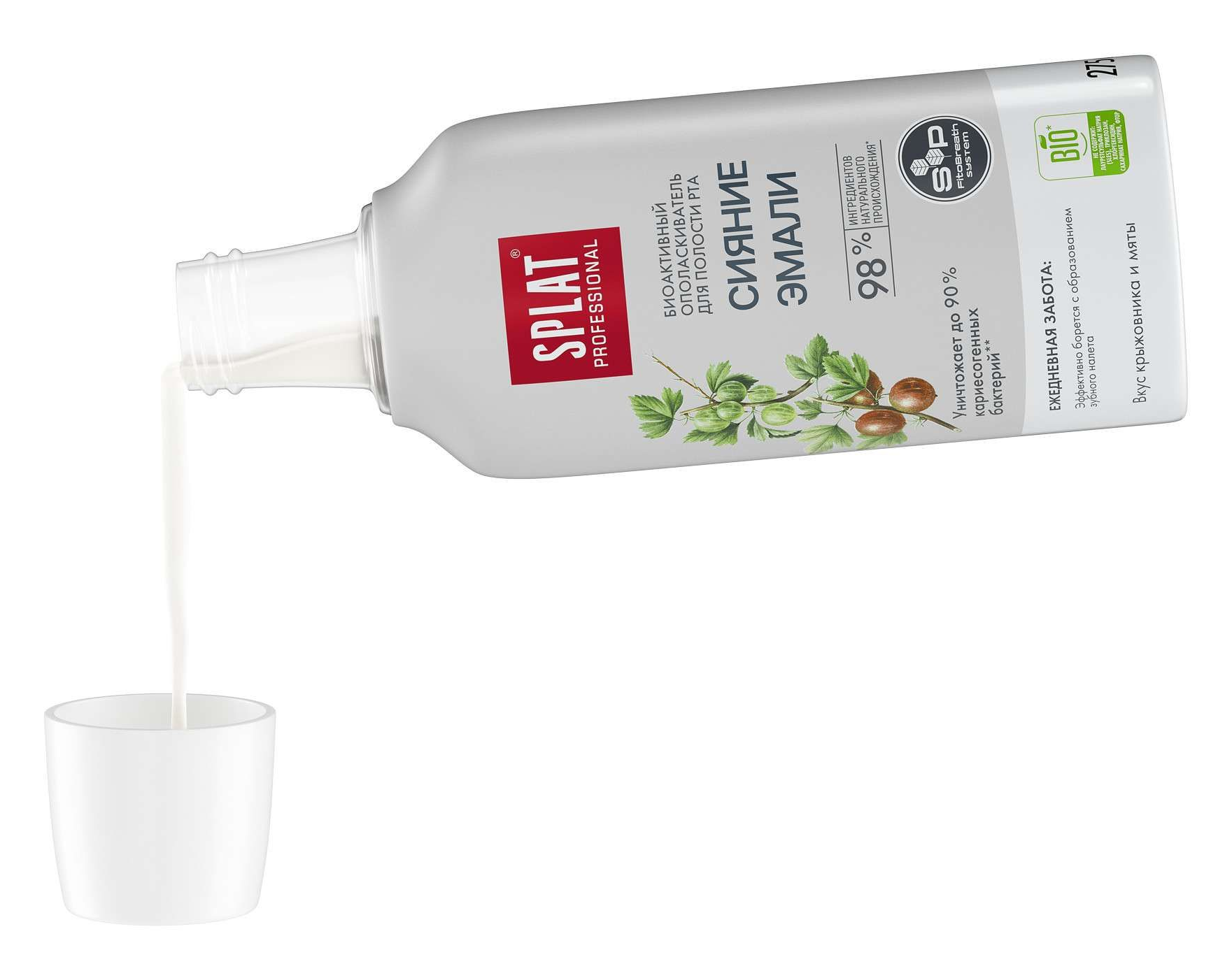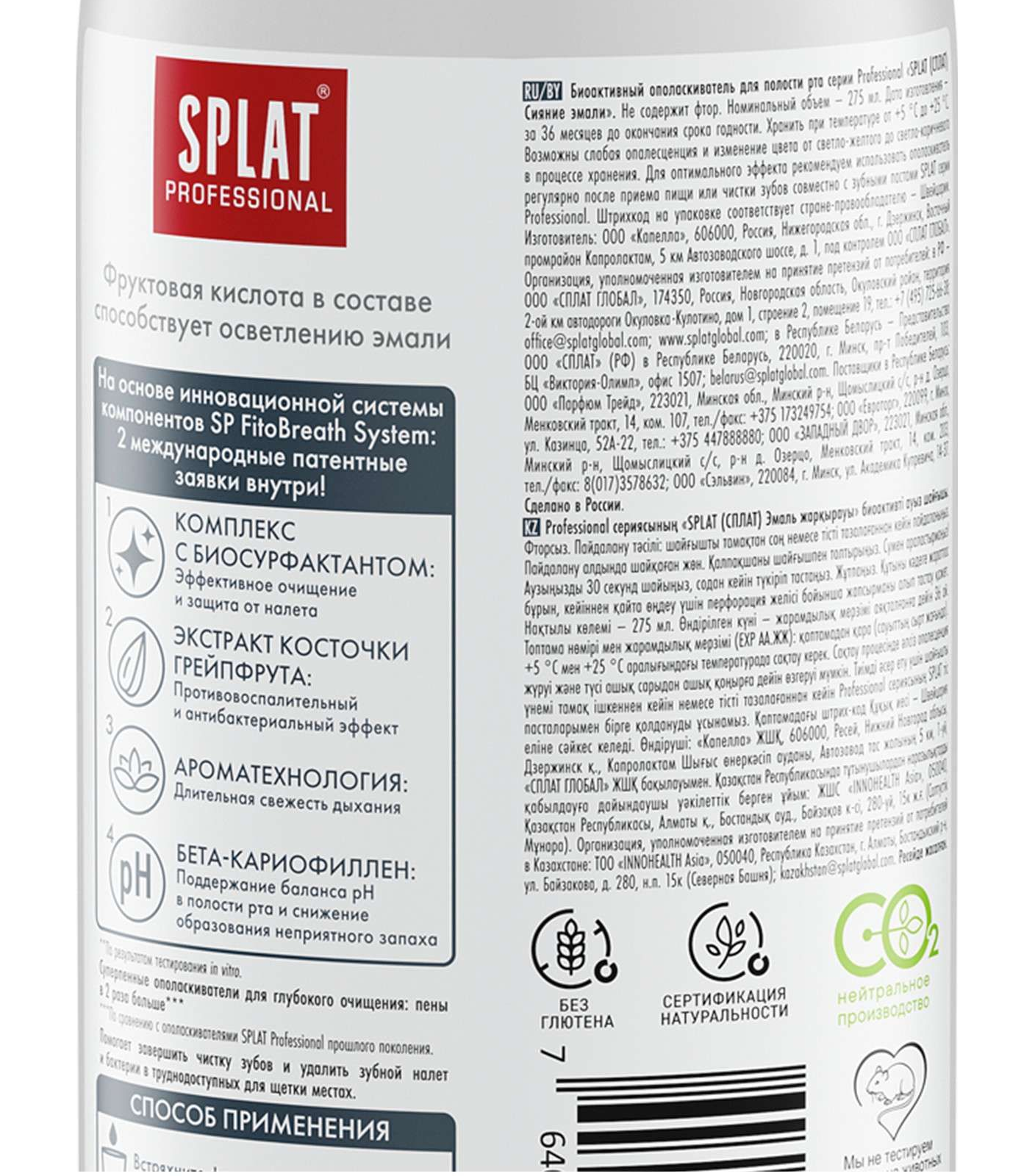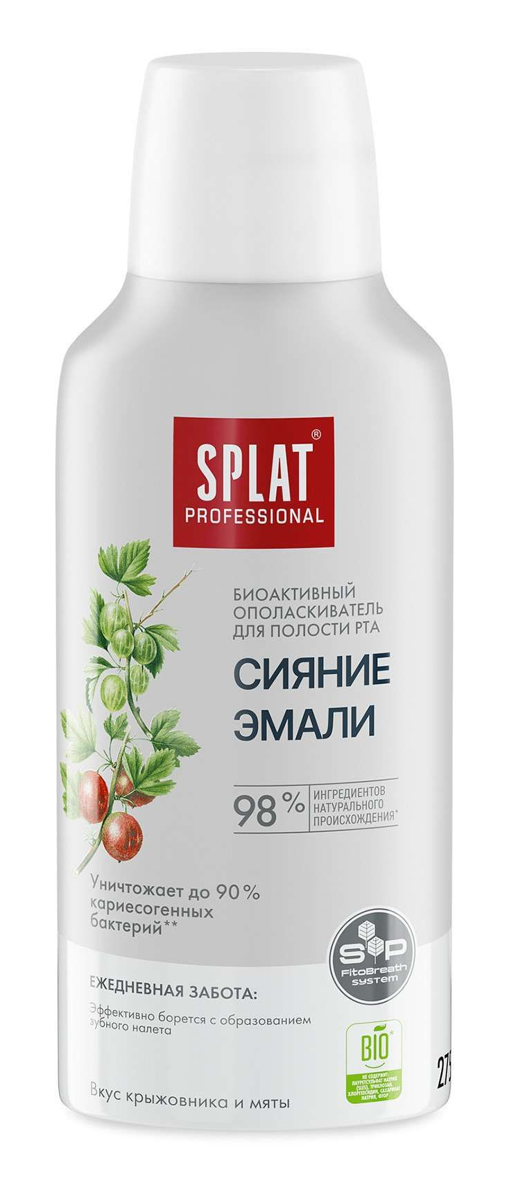 Ополаскиватель для полости рта SPLAT Professional содержит систему активов SP. FitoBreath System, что включает в себя комбинацию специальных ПАВ. Эта комбинация создает пену для эффективного очищения от налета и остатков пищи, тем самым эффективно предотвращая рост кариесогенных бактерий, а также поддерживает здоровье десен и пролонгирует свежее дыхание и чистоту зубов. Активы в SP. FitoBreath System также отвечают и за долгое сохранение свежести дыхания, противовоспалительный эффект и поддержания баланса pH в полости рта, тем самым улучшая гигиену.