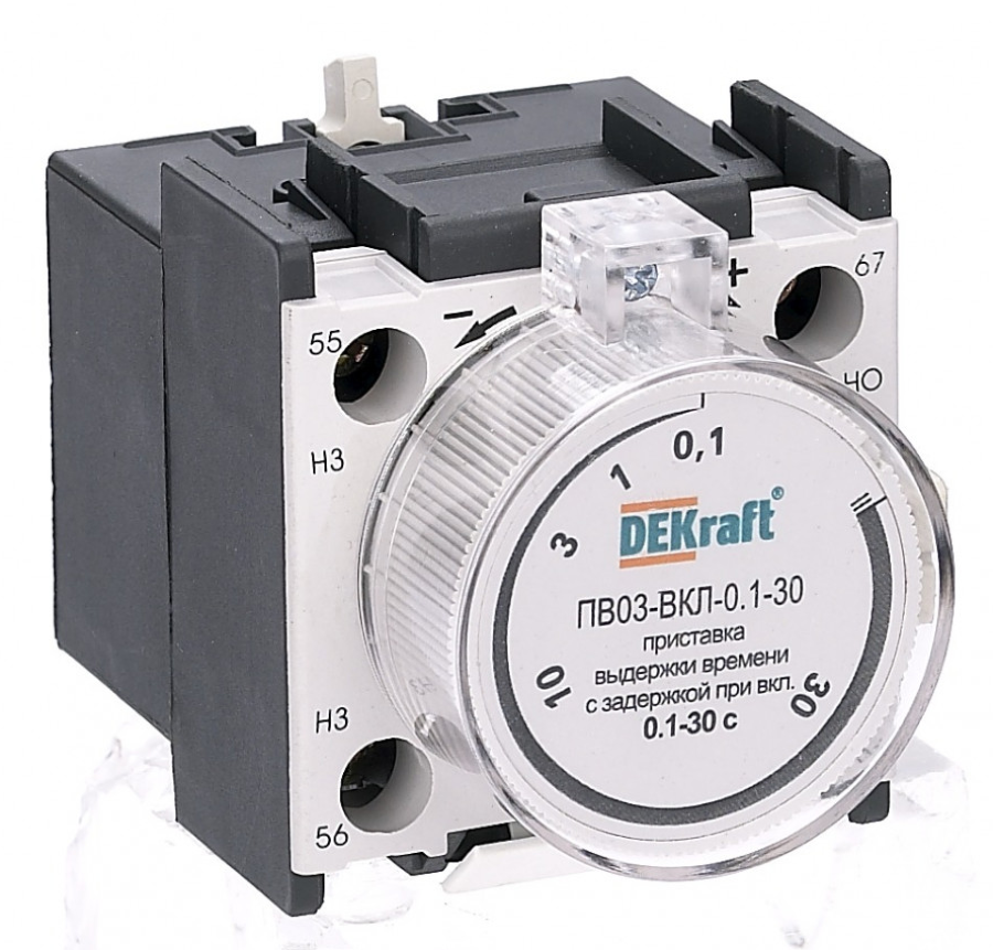 Приставка выдержки времени ПВ-03 для контакторов КМ-103 Dekraft; выдержка — 10…180 секунды; задержка — при включении; ном.ток 10 А; ном.напряжение до 690 В; монтаж защелкой на контакторе; степень защиты IP20.