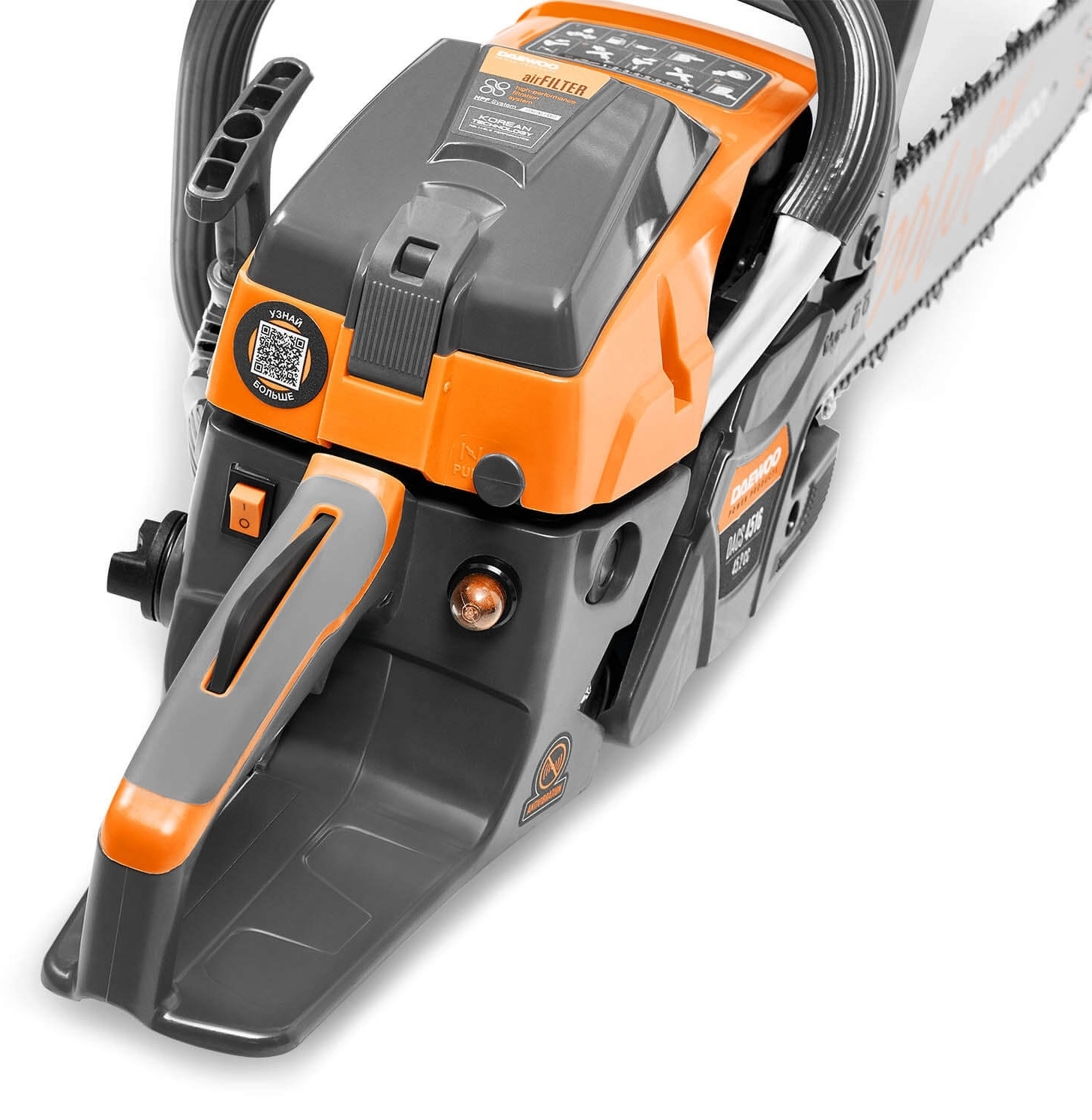 Пила бензиновая DAEWOO выделяется простотой запуска. Легкий вес модели делает её маневренной, а антивибрационная система повышает комфорт во время работы.