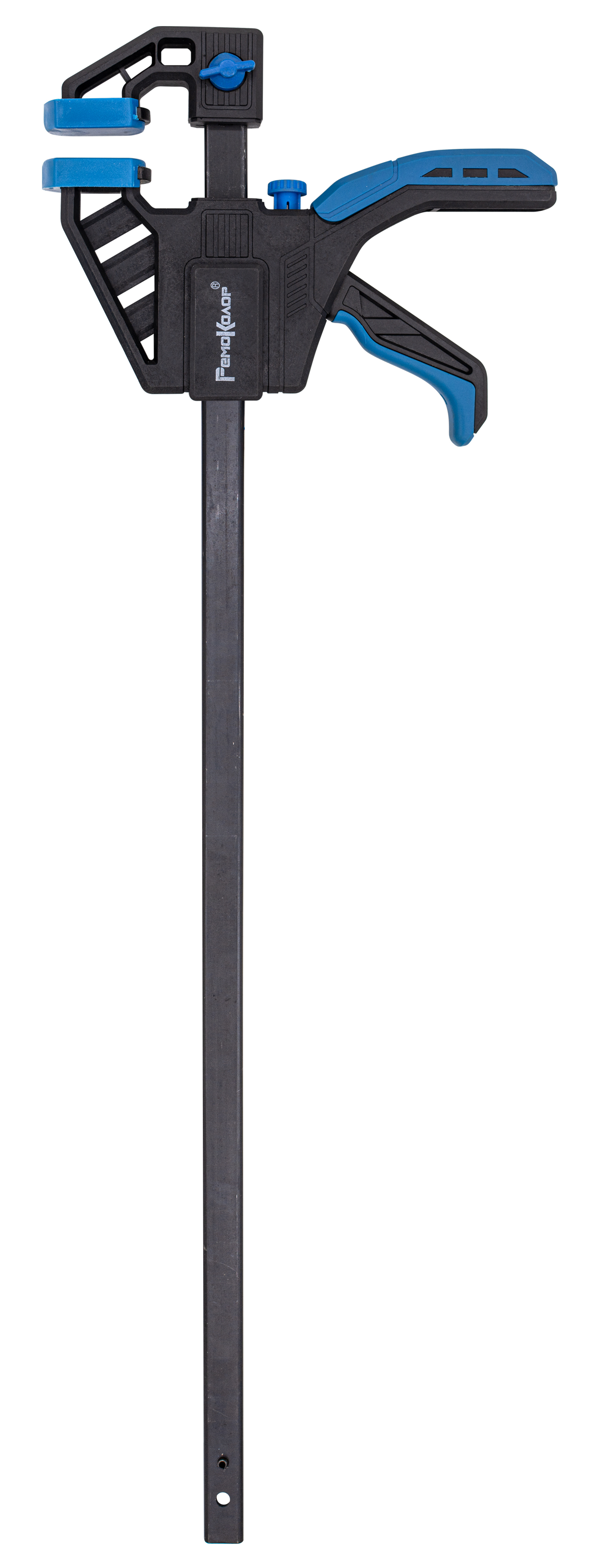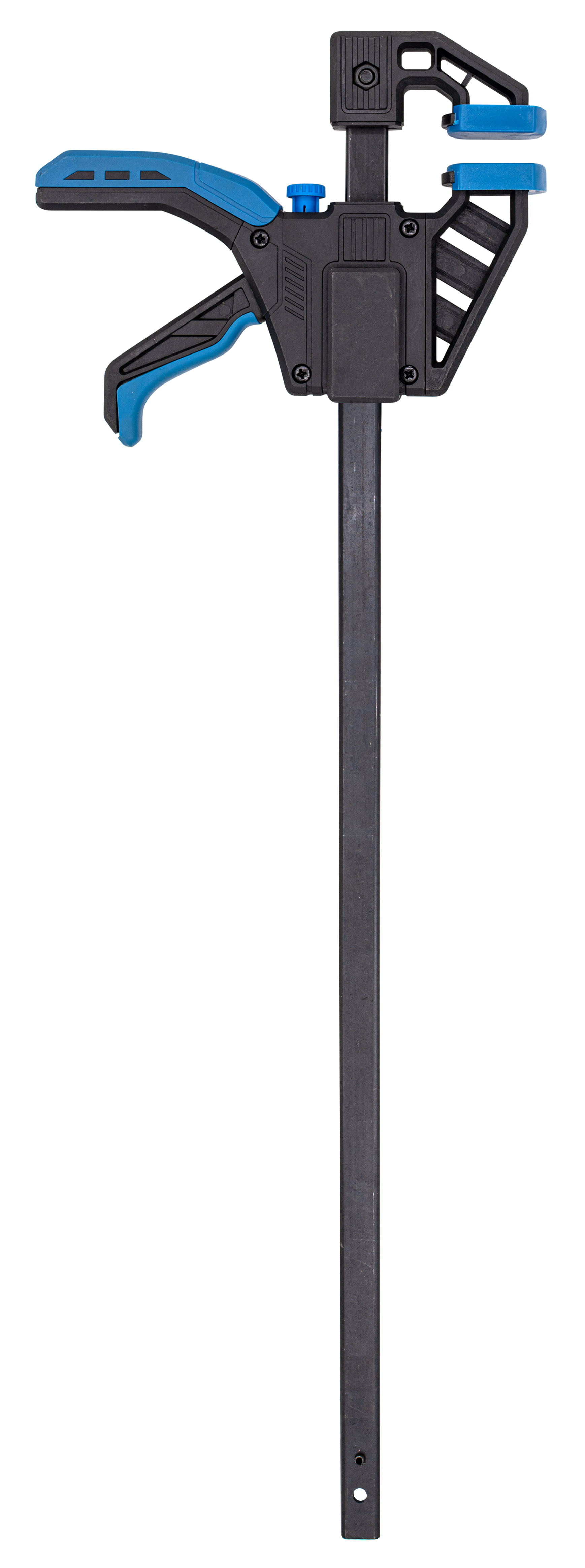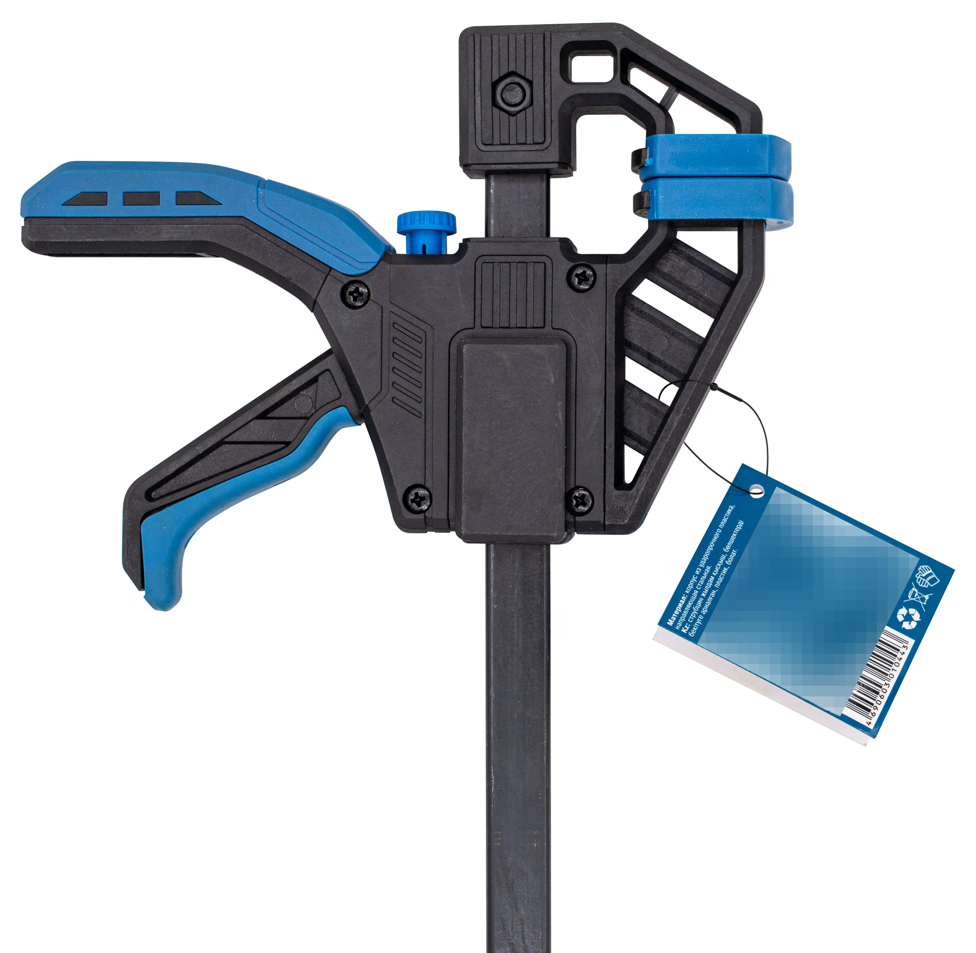Шина струбцины — сталь холоднотянутая. Защитное покрытие шины — оксидирование. Механизм прижимной части — комбинированный (пластик+металл+резина). Пластиковая накладка на прижимную губку. Используется при строительных и ремонтных работах. Оснащена быстрозажимным механизмом. Рукоятка имеет пистолетную форму, что очень удобно, и выполнена из высококачественной пластмассы.