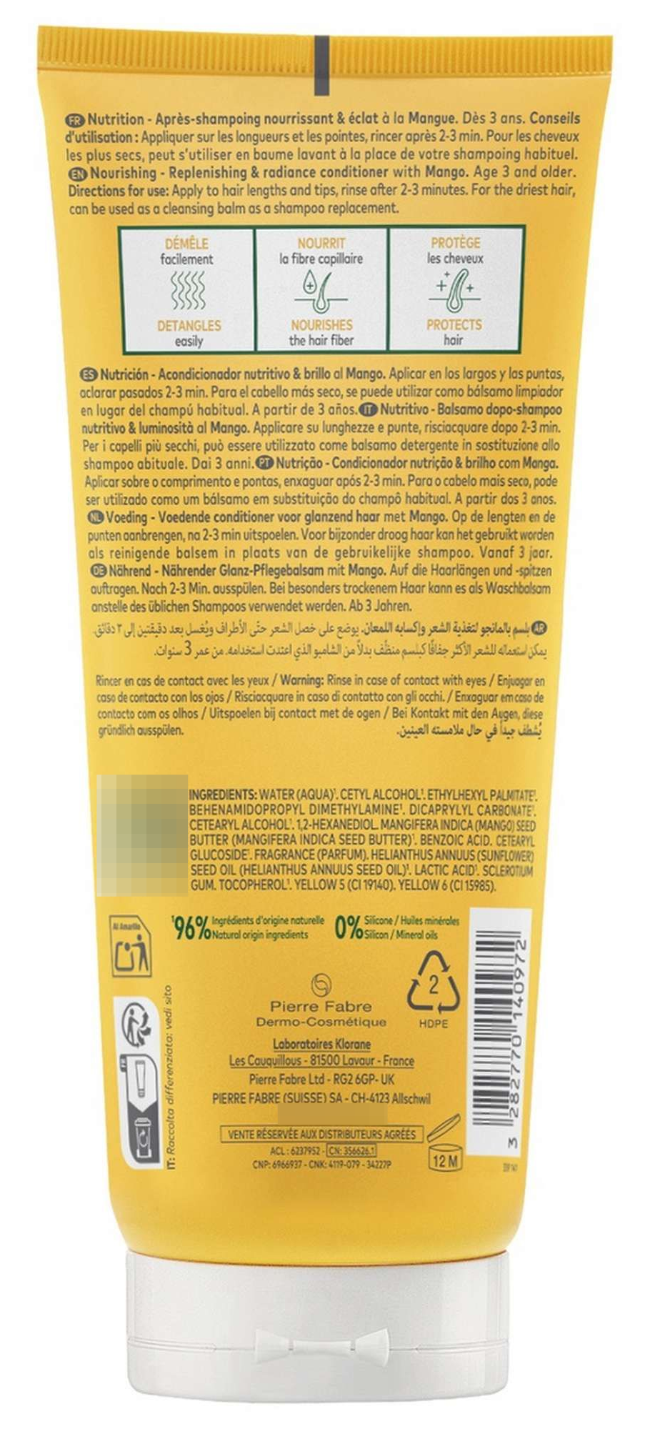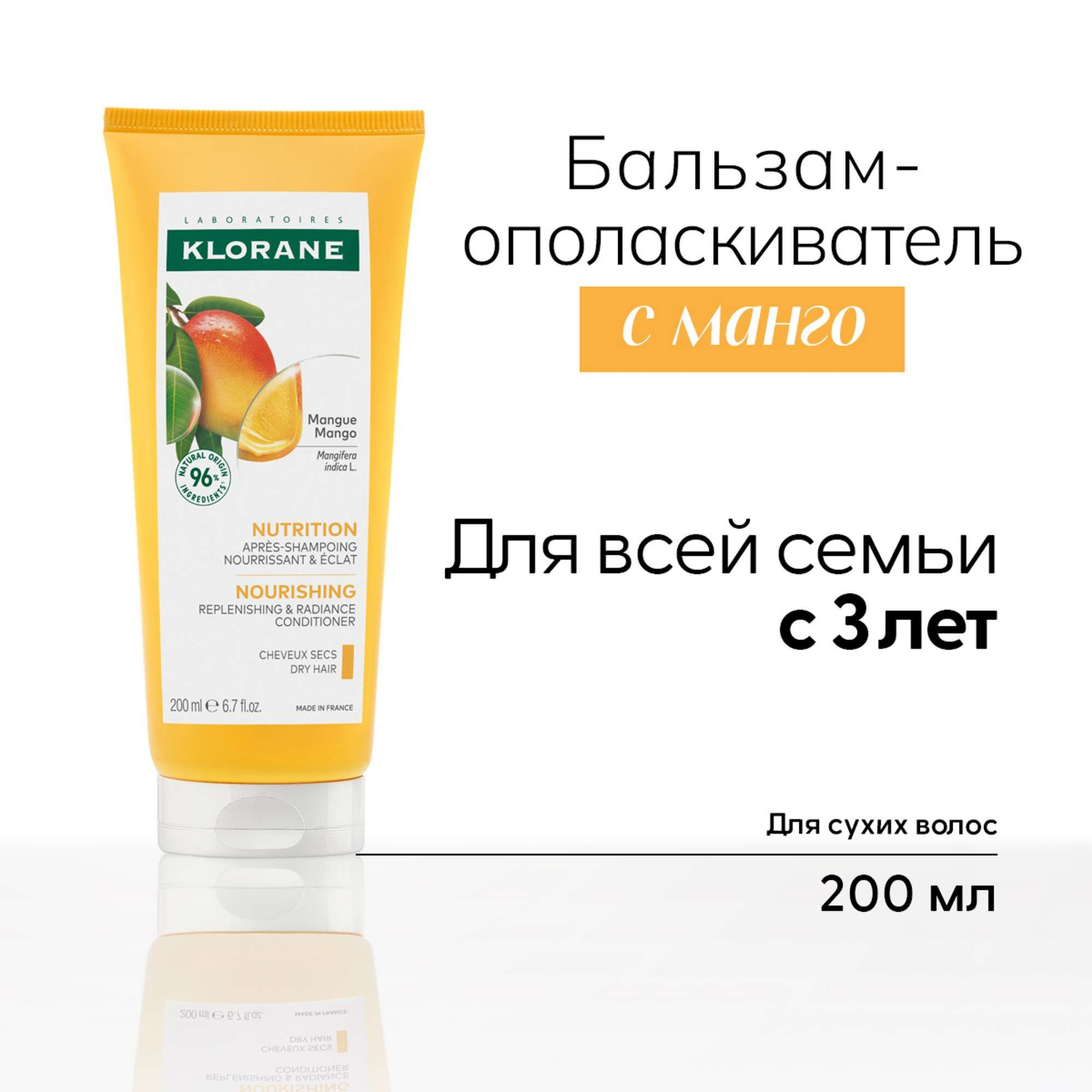 KLORANE Бальзам-ополаскиватель питание и блеск с маслом манго. Для взрослых и детей с 3х лет. Для сухих волос. Быстро распутывает волосы; Питает; Защищает волосы. Процентное содержание ингредиентов натурального происхождения (natural origin ingredients) см. на упаковке. Не содержит силиконов, минеральных масел. Упаковка состоит из перерабатываемого пластика.