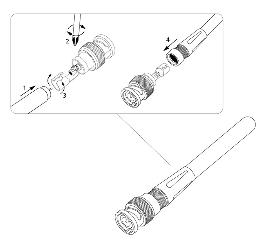 BNC-коннектор под винт — электрический разъем с байонетной фиксацией закрепляется на кабеле зажимом с помощью винта центрального контакта (центральная жила — под винт, оплетка — обжимается).
