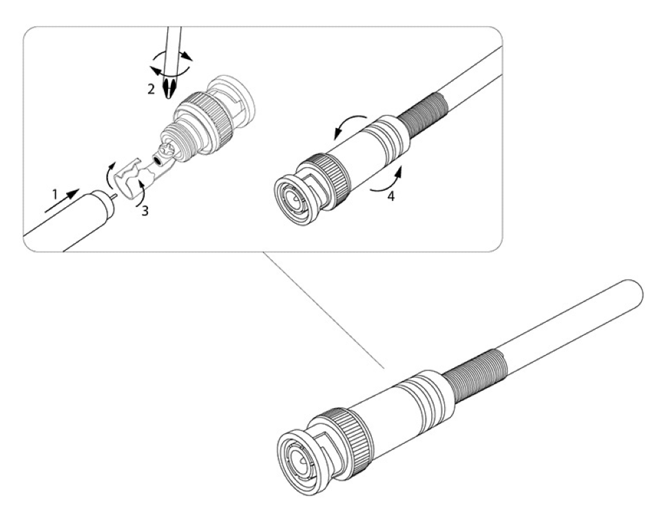 Предназначен для подключения коаксиального кабеля c волновым сопротивлением 50 и 75 Ом, диаметром до 7 мм, к видеокамерам, видеорегистраторам, мониторам и другим радиоэлектронным устройствам. BNC-коннектор (BNC сокр. от Bayonet Neill Concelman) под винт — электрический разъем с байонетной фиксацией закрепляется на кабеле зажимом с помощью винта центрального контакта (центральная жила — под винт, оплетка — обжимается). Этот способ крепления значительно проще и быстрее, чем пайка, но его надежность и качество соединения остаются на неизменно высоком уровне. Металлический колпачок с пружиной защищает соединения и предотвращает кабель от перегиба в месте крепления к разъему. BNC-разъем изготовлен из материалов: корпус — никелированный цинк; центральный контакт — латунь с напылением технического золота; диэлектрик — фторопласт; колпачок с пружиной — металл.