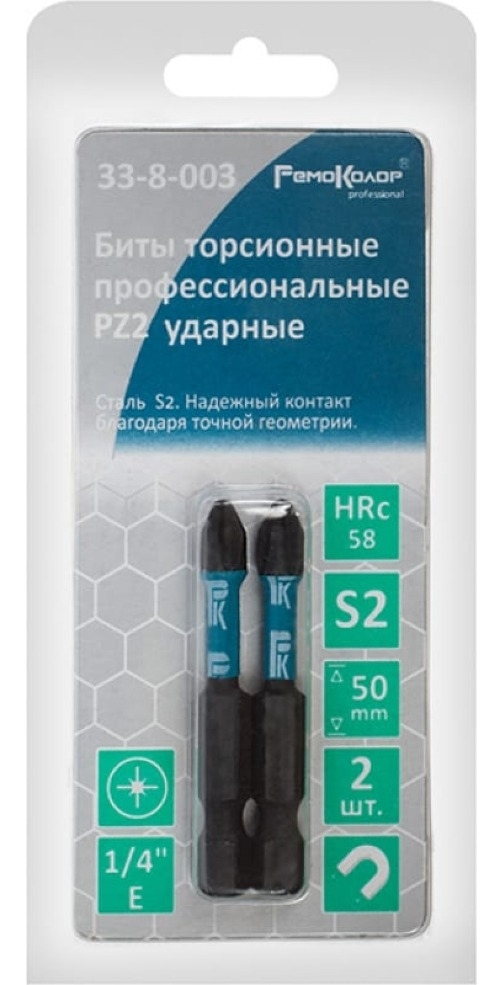 Биты профессиональные торсионные (2 шт; PZ2x50 мм; сталь S2; 1/4" Е) РемоКолор 33-8-003 предназначены для монтажа/демонтажа крепежных изделий с помощью шуруповертов и винтовертов с тангенциальным ударом. Торсионная зона (утоньшение) обеспечивает упругость оснастки и предохраняет биту от поломки при больших нагрузках. Сталь S2 обеспечивает высокий ресурс работы и защиту от коррозии. Надежный контакт благодаря точной геометрии. Намагниченное жало биты позволяет легко удерживать крепеж.