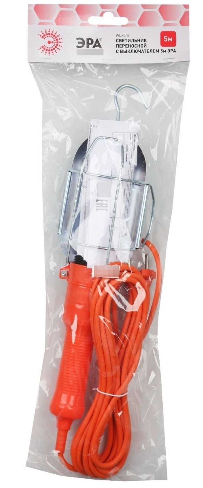 Светильник переносной Эра WL-5m с выключателем 5 м. Цоколь Е27 для подключения источника света до 60 Вт. Идеально подходит для гаража или подсобных помещений.
