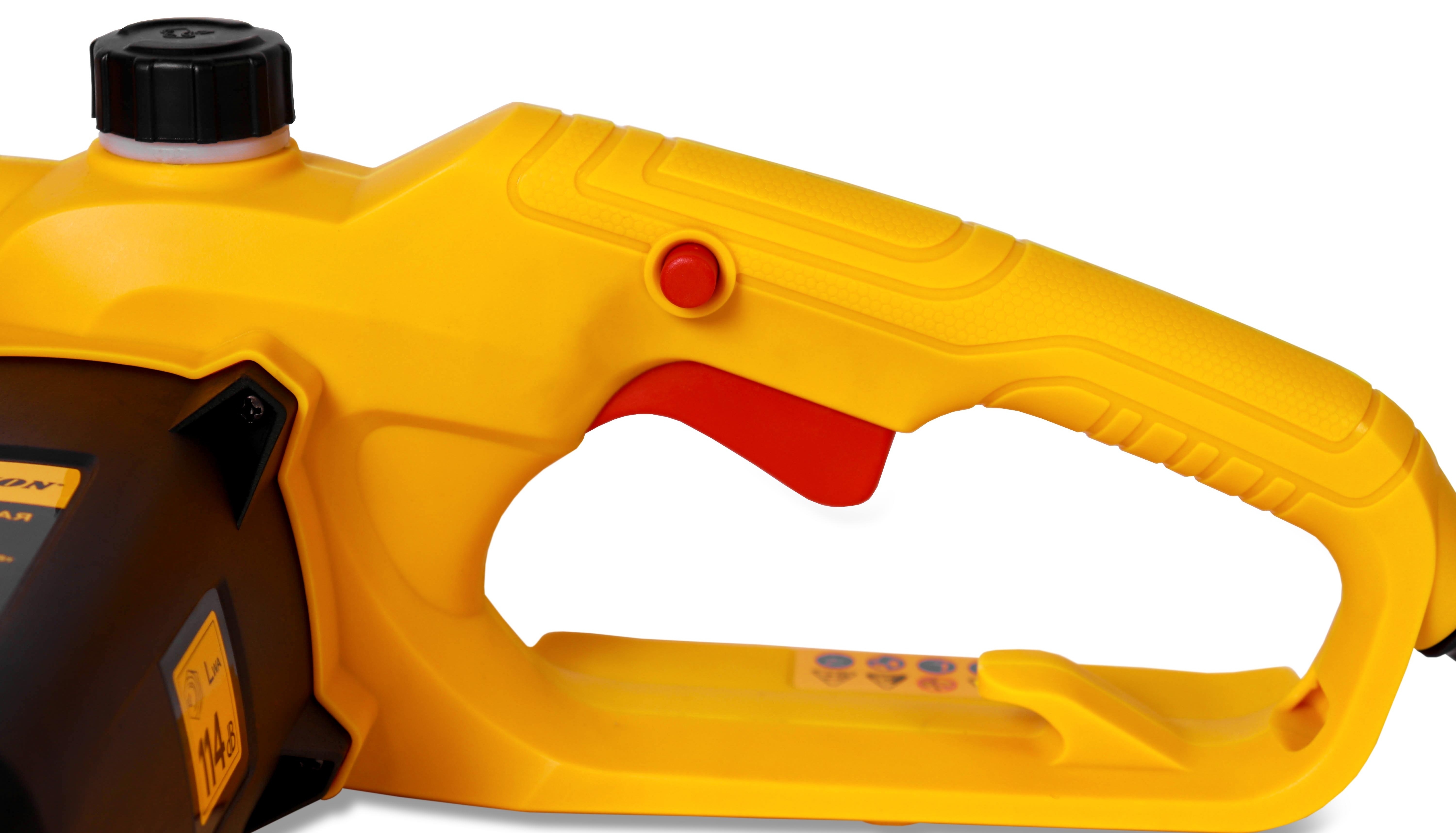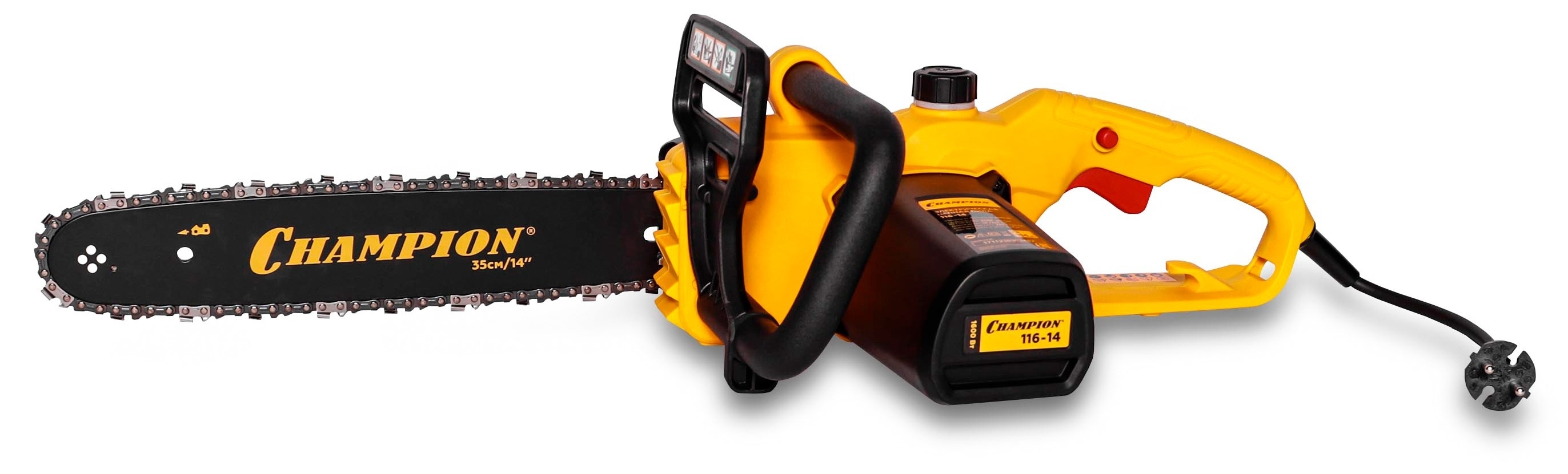 Эргономичная рукоятка электропилы цепной Champion 116-14» гарантирует точный контроль. Специальный фиксатор кабеля исключает случайное отключение от сети 220 В.
