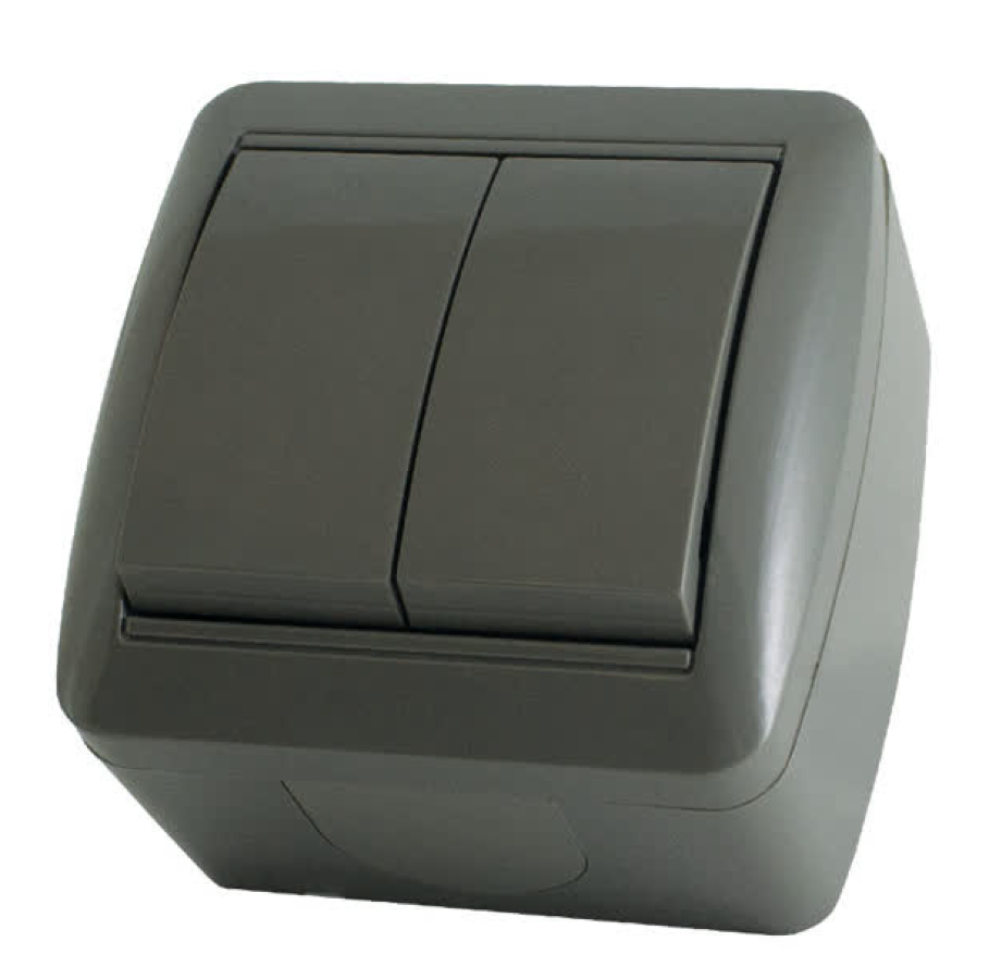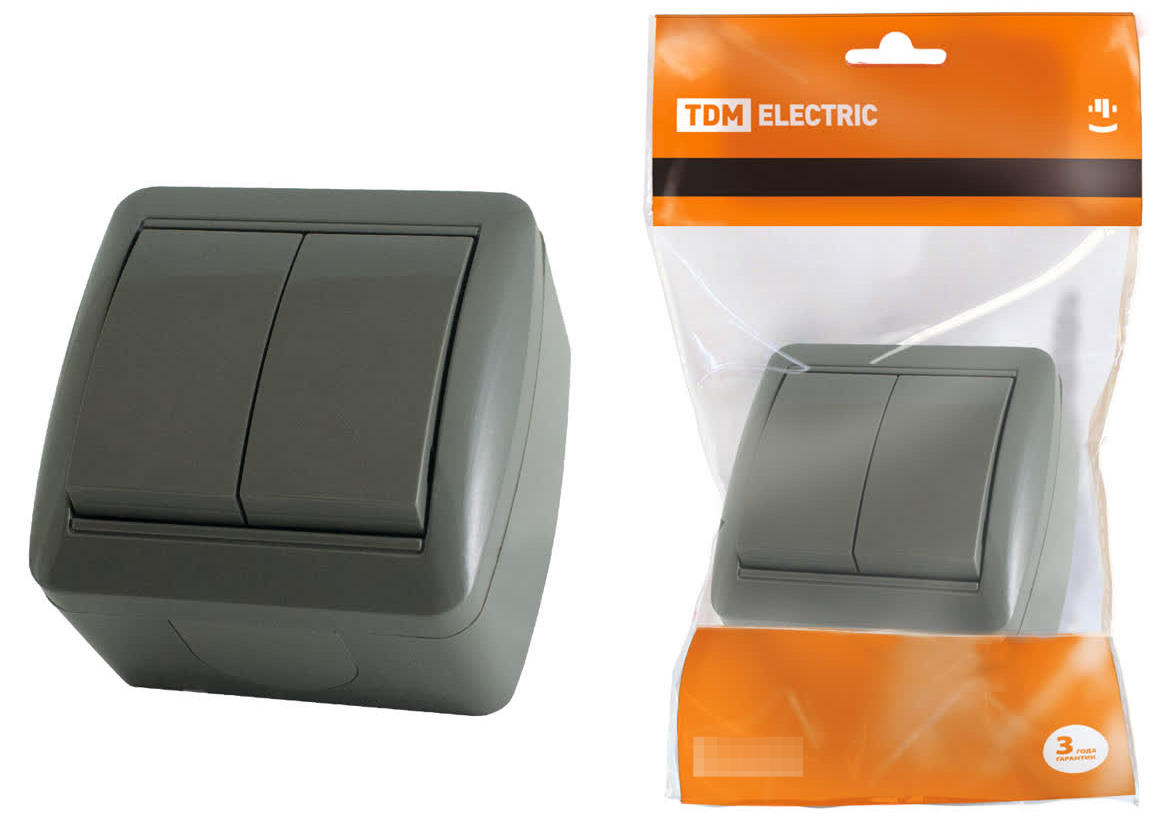 Двухклавишный выключатель TDM Electric Селигер представлен в сером цвете, он идеально впишется в любой интерьер.