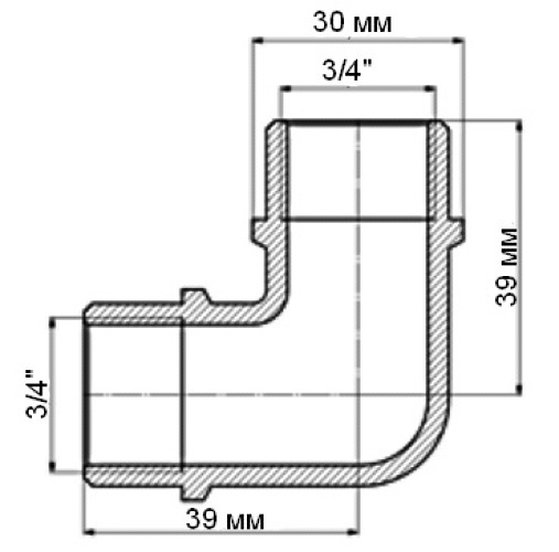 Угольник с наружной резьбой 3/4" VG-201302. Применяется для монтажа трубопроводных систем (водопроводных, хозяйственно-питьевых, отопительных), транспортирующих среды, не агрессивные к материалам изделия.