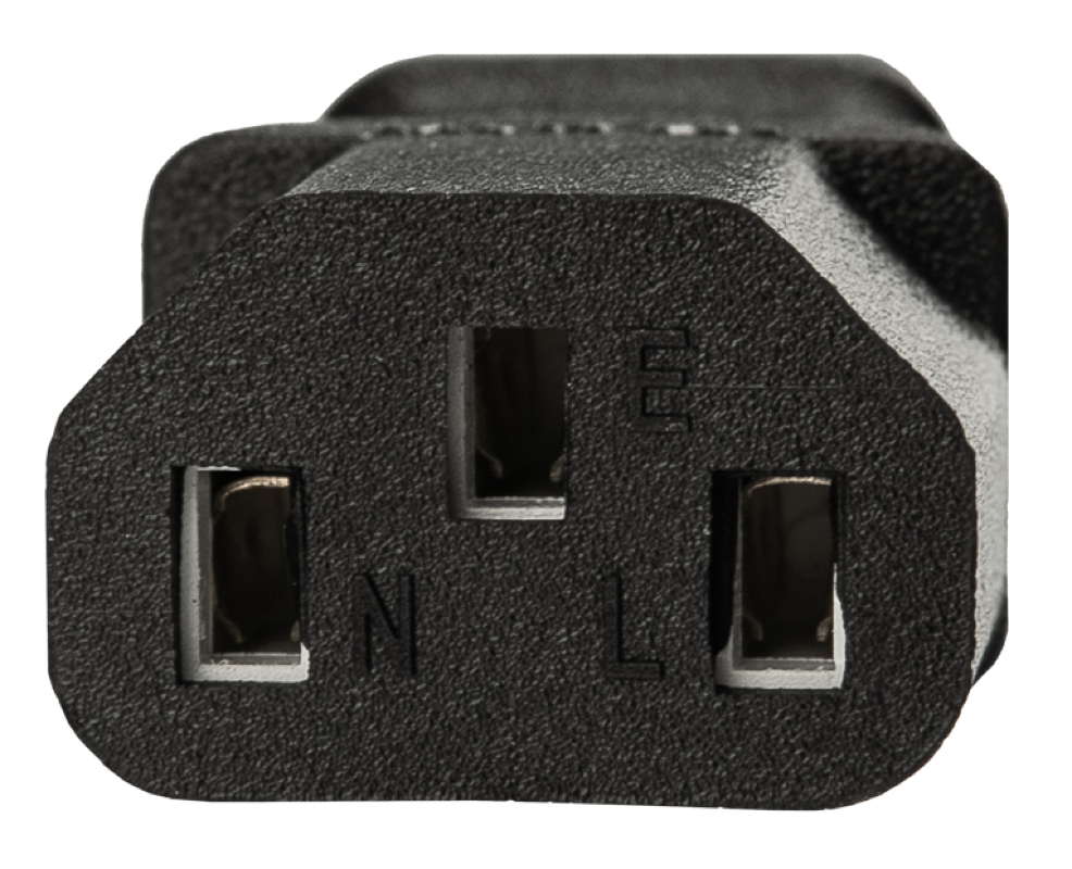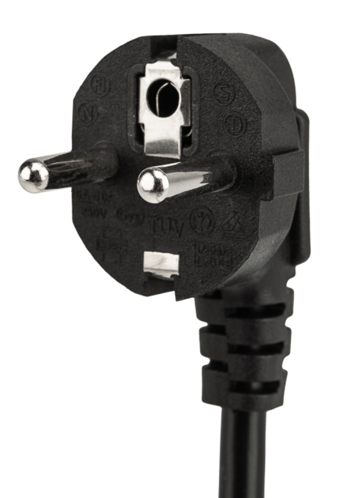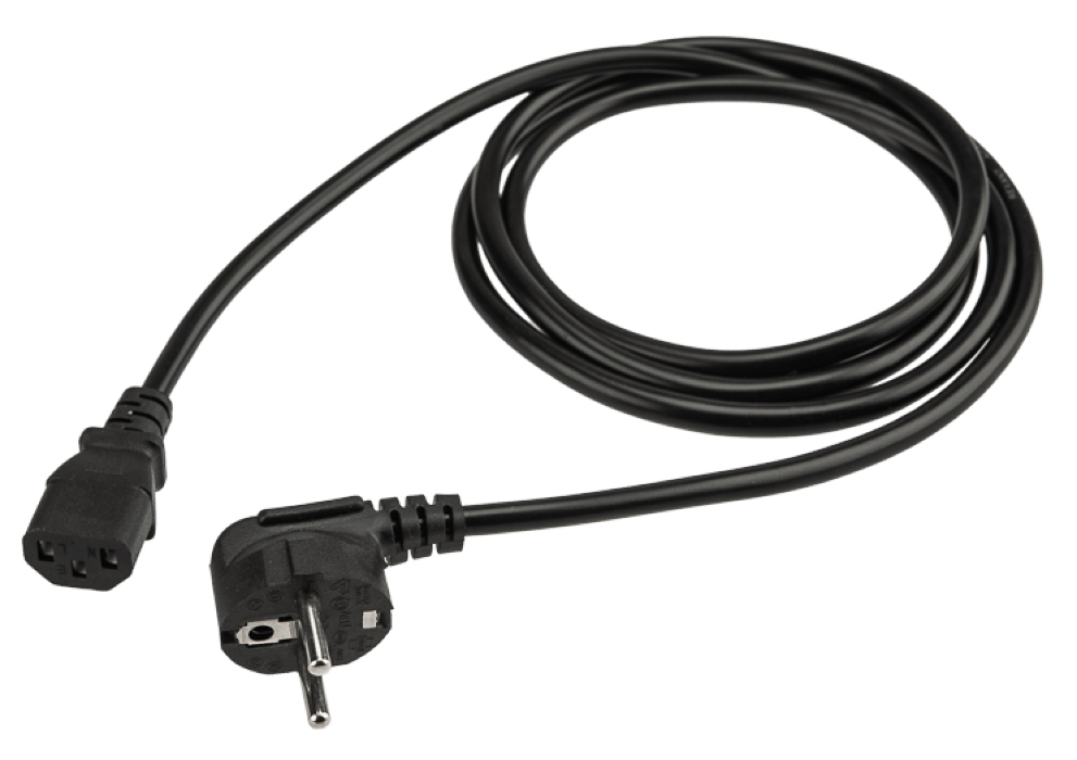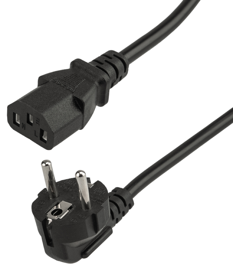 Данный шнур IEC оснащен с одной стороны неразборной литой угловой вилкой СЕЕ 7/7(Schuko) с заземляющим контактом, с другой — литым трехконтактным гнездовым разъемом IEC 320 C13 и трехжильным проводом с сечением проводника 0.75 мм².