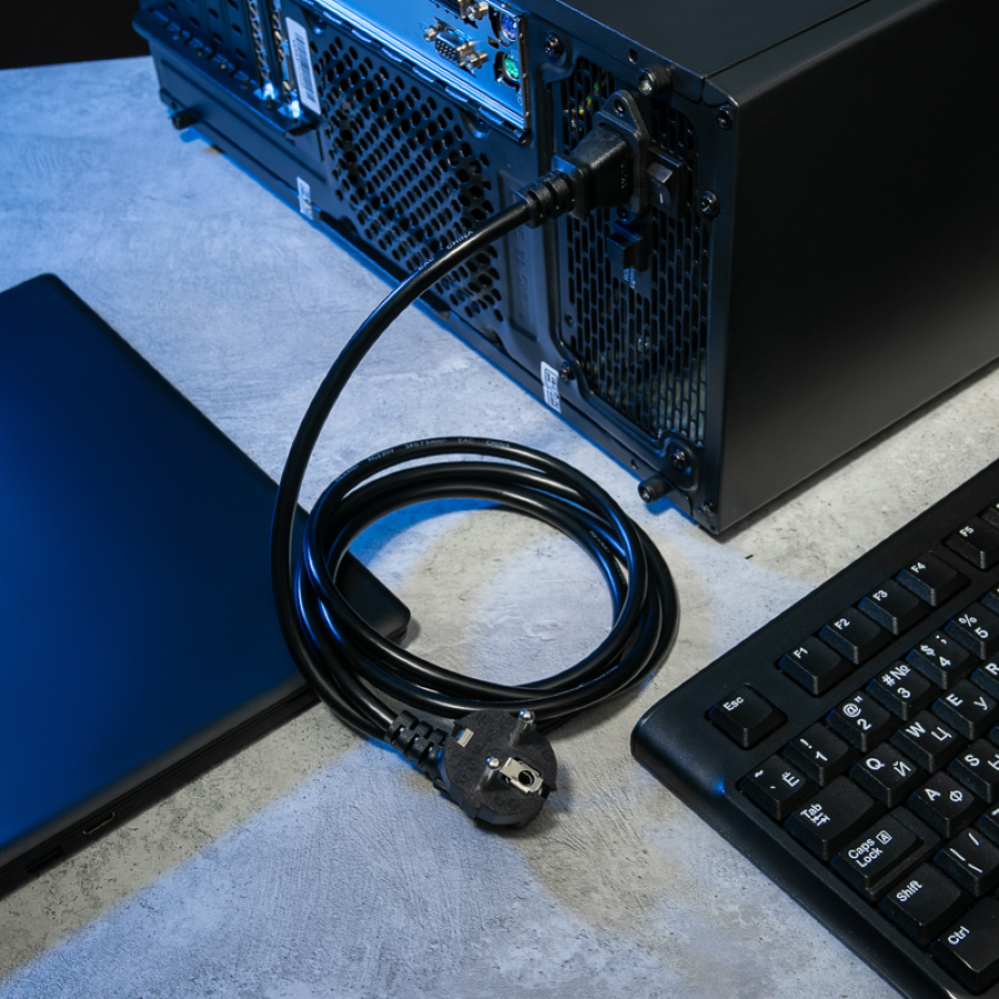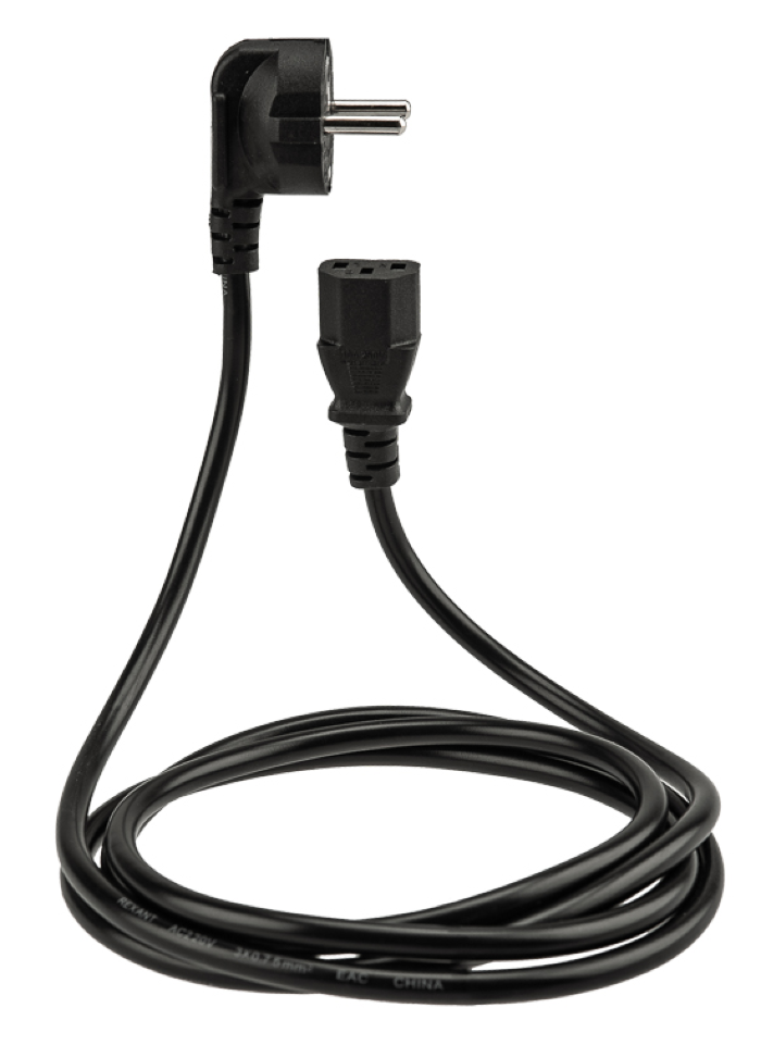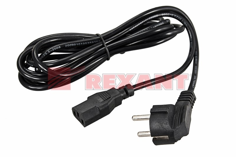 Шнур сетевой СЕЕ 7/7(Schuko) — IEC 320 C13 0.75 мм² 1.8 м (PE) (с заземлением) REXANT предназначен для подключения к сети переменного тока с напряжением 220 B стационарных персональных компьютеров, мониторов, ИБП, принтеров и других периферийных устройств, имеющих штыревой разъем типа C14.