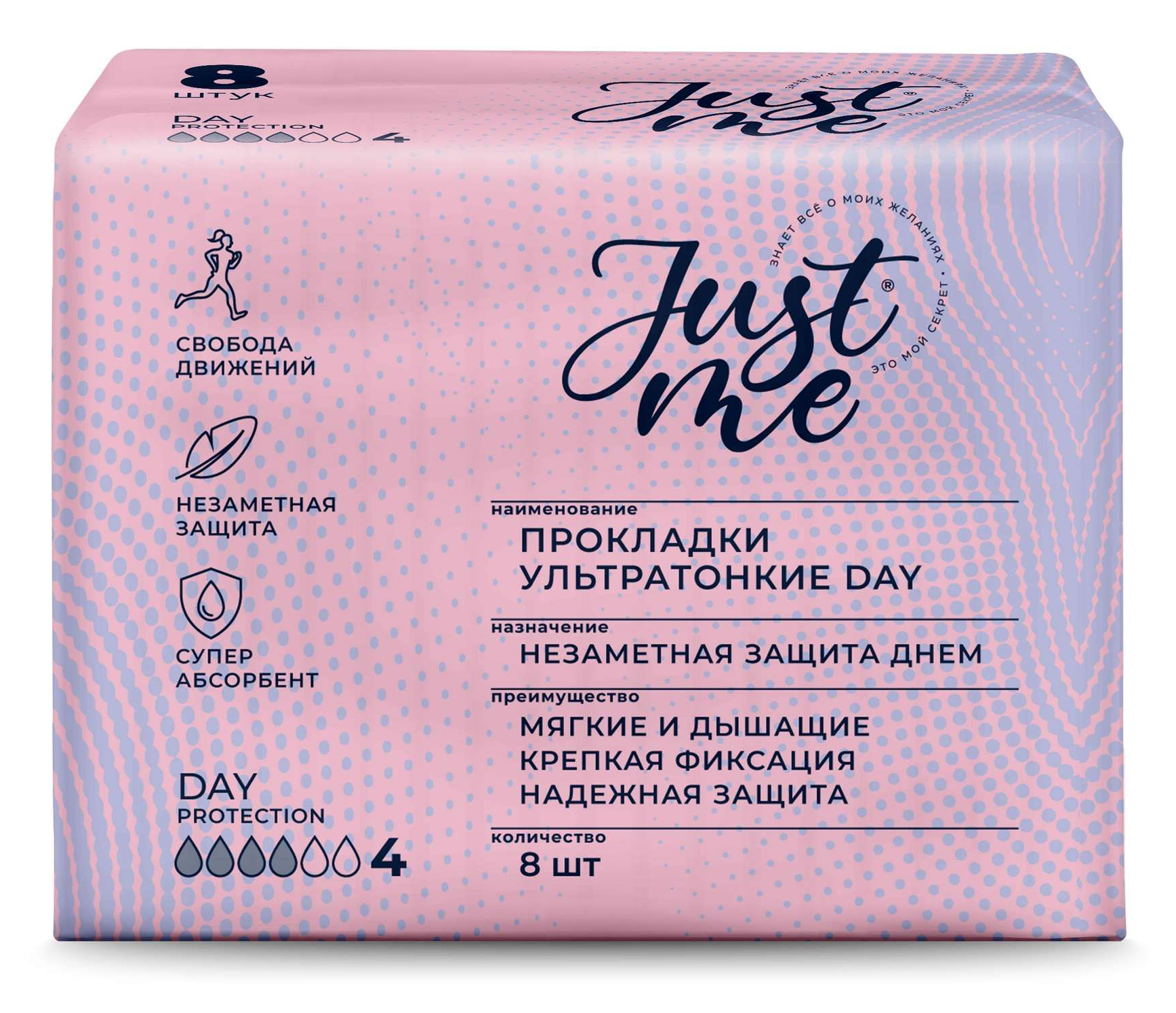 Гигиенические прокладки — это аксессуар, который обязательно присутствует в арсенале каждой женщины. Прокладки женские Just me — это 8 прокладок, которые обеспечивают все грани комфорта.