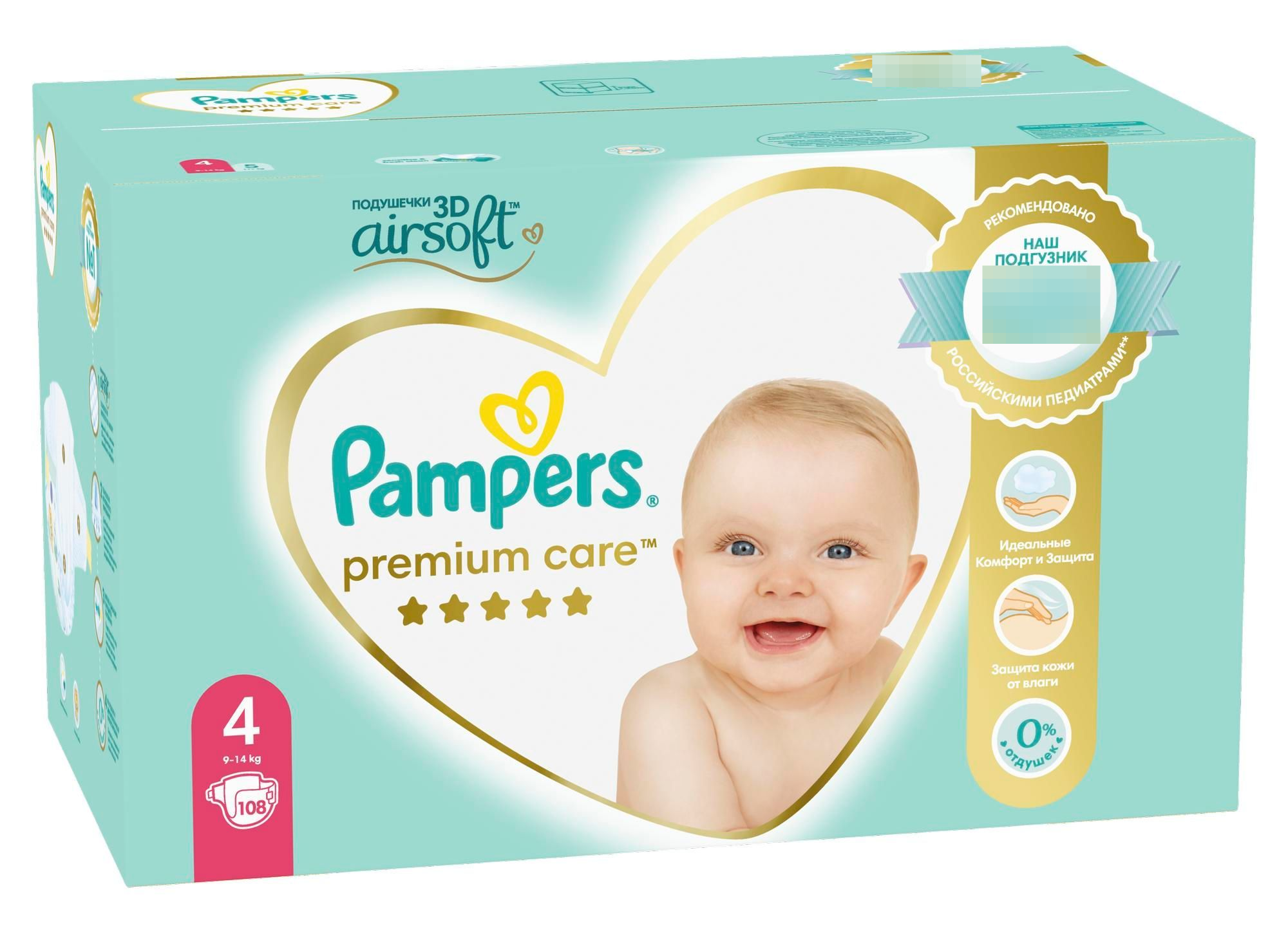 Подгузники детские Pampers Premium Care реализуются в индивидуальной упаковке. Размер — 4 (9-14 кг). Изготавливаются с использованием самых безопасных материалов и технологий. Содержат в своем составе органический хлопок. Количество в упаковке — 108 шт.