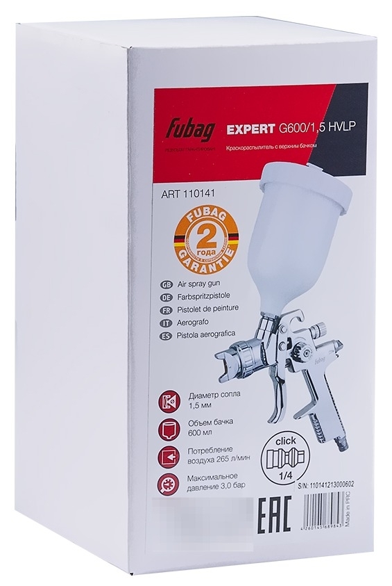 Пневматический краскопульт Fubag EXPERT G600/1.5 (арт. 110141). Краскораспылитель EXPERT G600/1.5 HVLP c верхним бачком. Серия EXPERT специально разработана для финишных окрасочных работ в производстве мебели, кузовном ремонте, промышленной окраске. Модели EXPERT имеют высокую эффективность переноса краски и пониженное потребление воздуха. Отличаются хорошей эргономикой и простым обслуживанием.