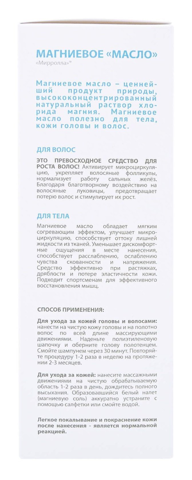 Для волос: Средство активирует микроциркуляцию крови кожи головы, способствуя укреплению волос и их росту. Магниевое масло нормализует работу сальных желез, предотвращает выпадение и ломкость волос.