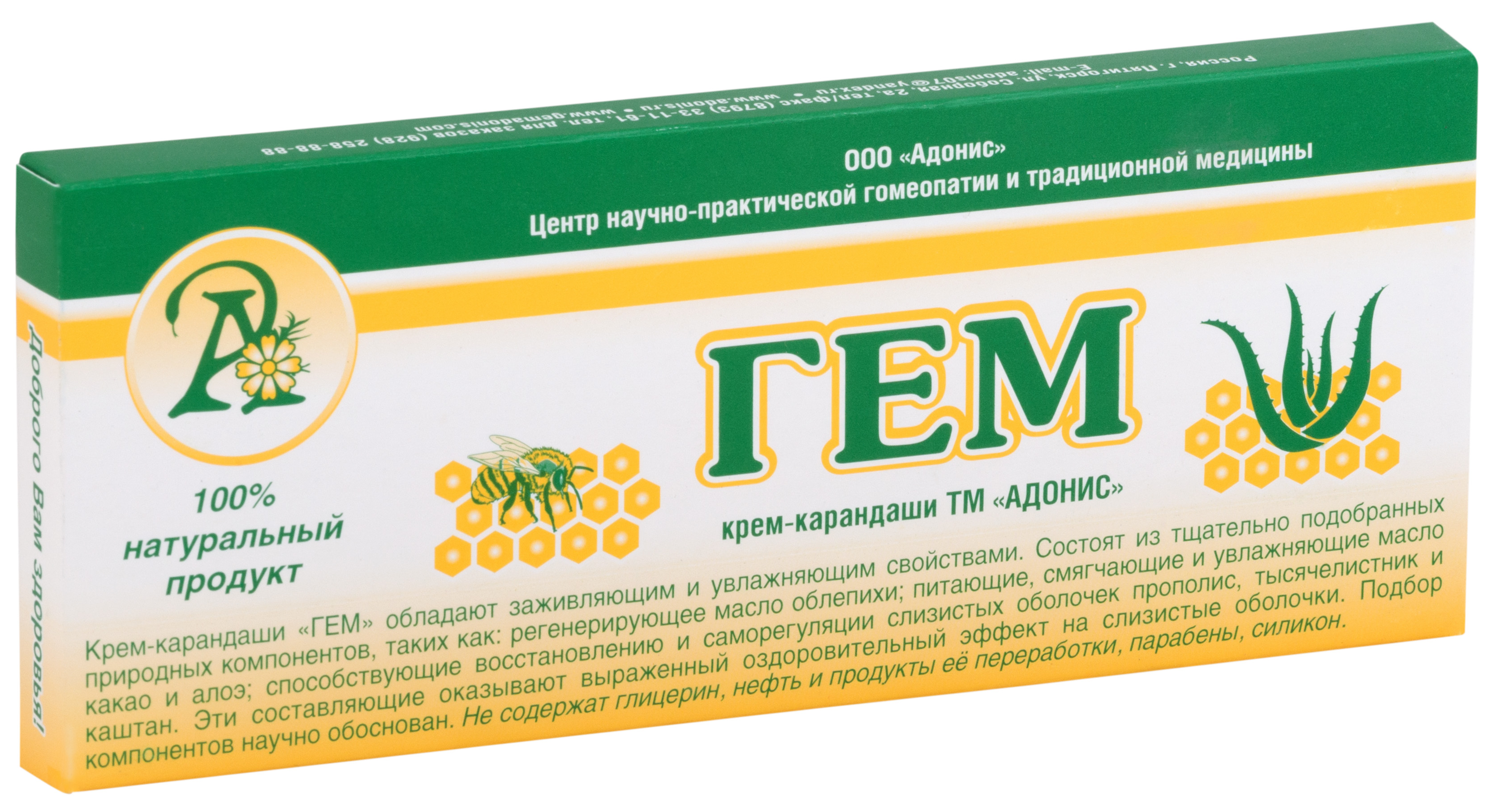 Это 100% натуральный продукт — обладает заживляющим и увлажняющим свойствами. Гем основан только на натуральных, природных органических элементах, таких как регенерирующее масло облепихи, питающие, смягчающие и увлажняющие масло какао и алоэ, снимающие раздражения, стимулирующие способность кожи и слизистых к саморегуляции прополис, тысячелистник и каштан. Все эти элементы оказывают оздоровительный эффект на кожу и слизистые оболочки. Не содержит глицерин, нефть, парабены, силикон.