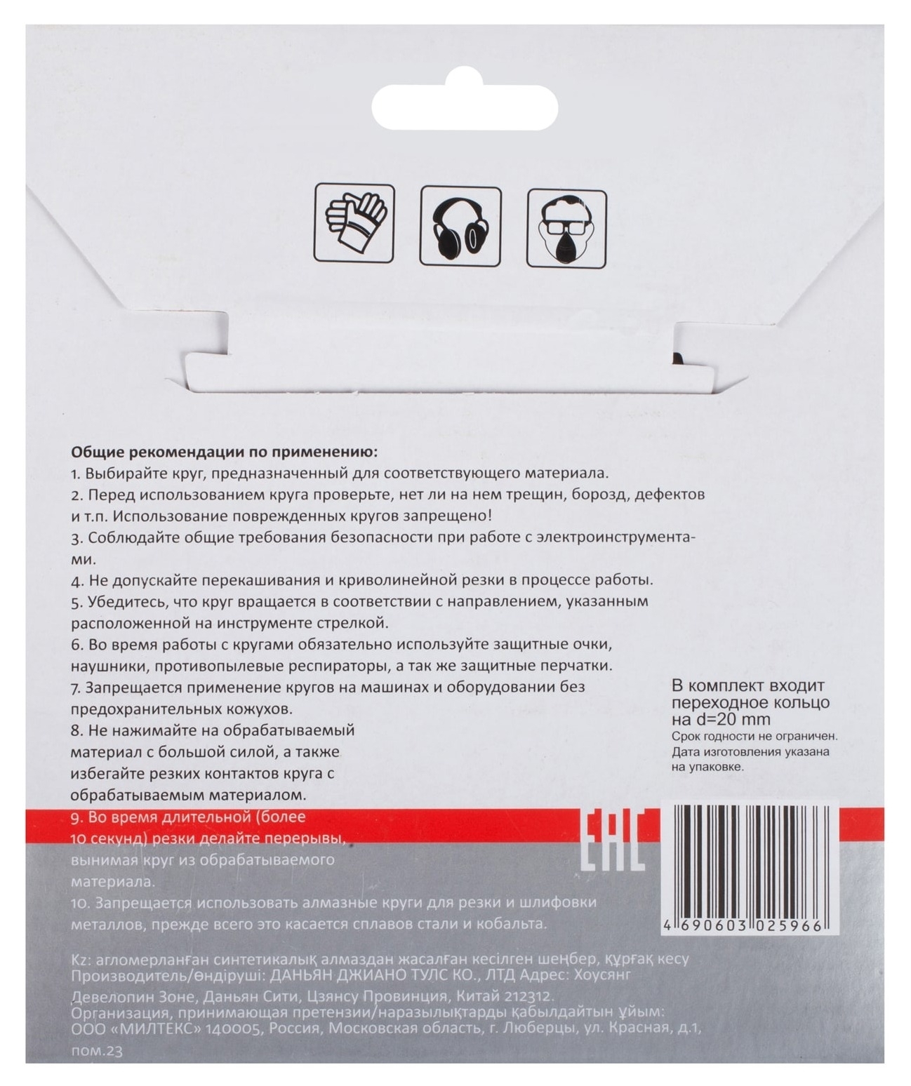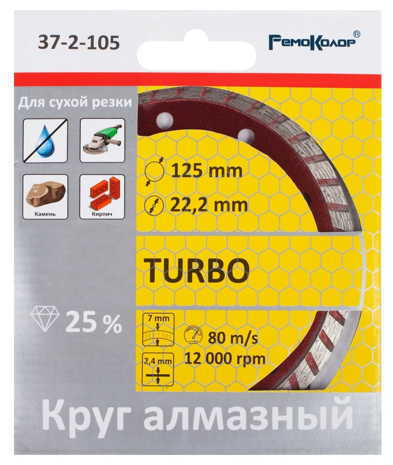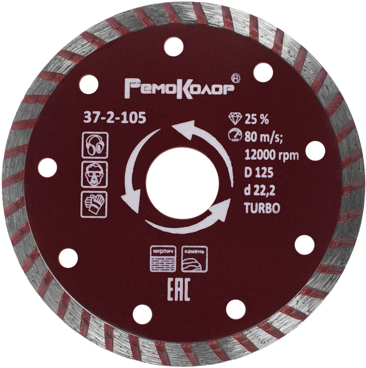 Универсальный отрезной алмазный диск РемоКолор "Турбо" 37-2-105. Диаметр: 125 мм. Посадочный диаметр: 22,2 мм. Применяется для сухого реза камня и кирпича.