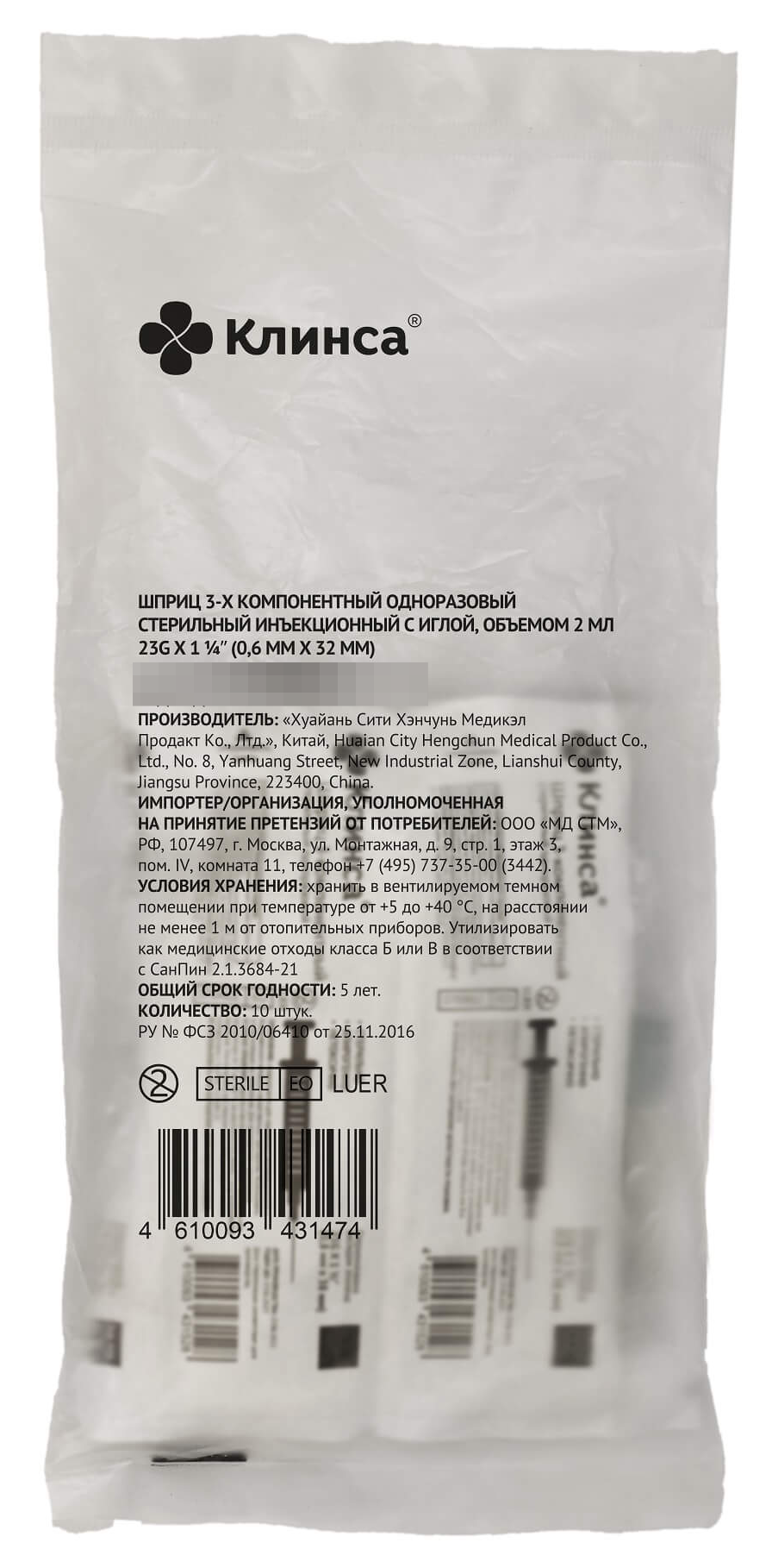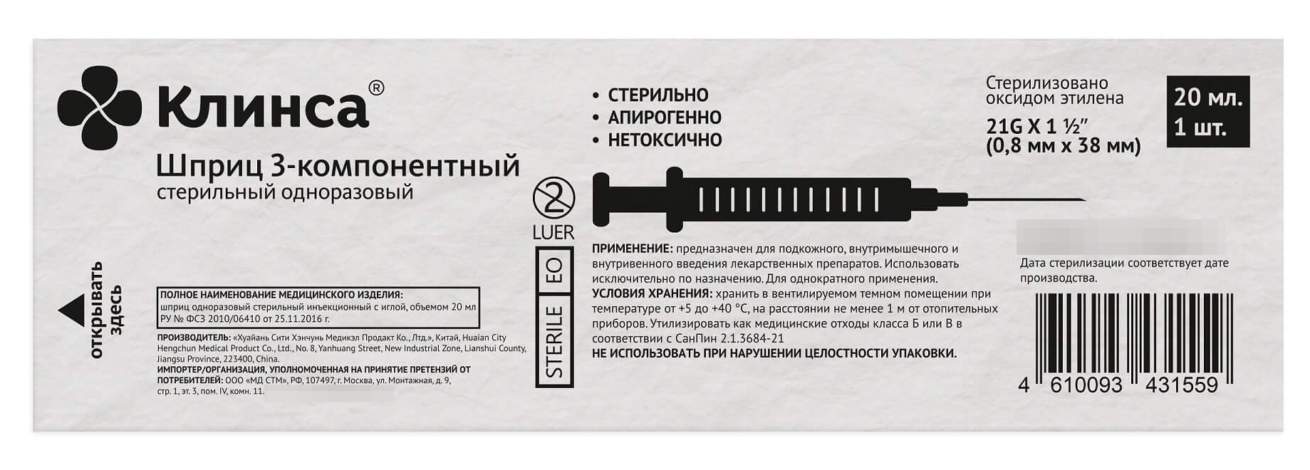 Шприц одноразовый, трехкомпонентный Клинса предназначен для подкожных, внутримышечных и внутривенных инъекций. Медицинский шприц нетоксичный, апирогенный, стерильный.