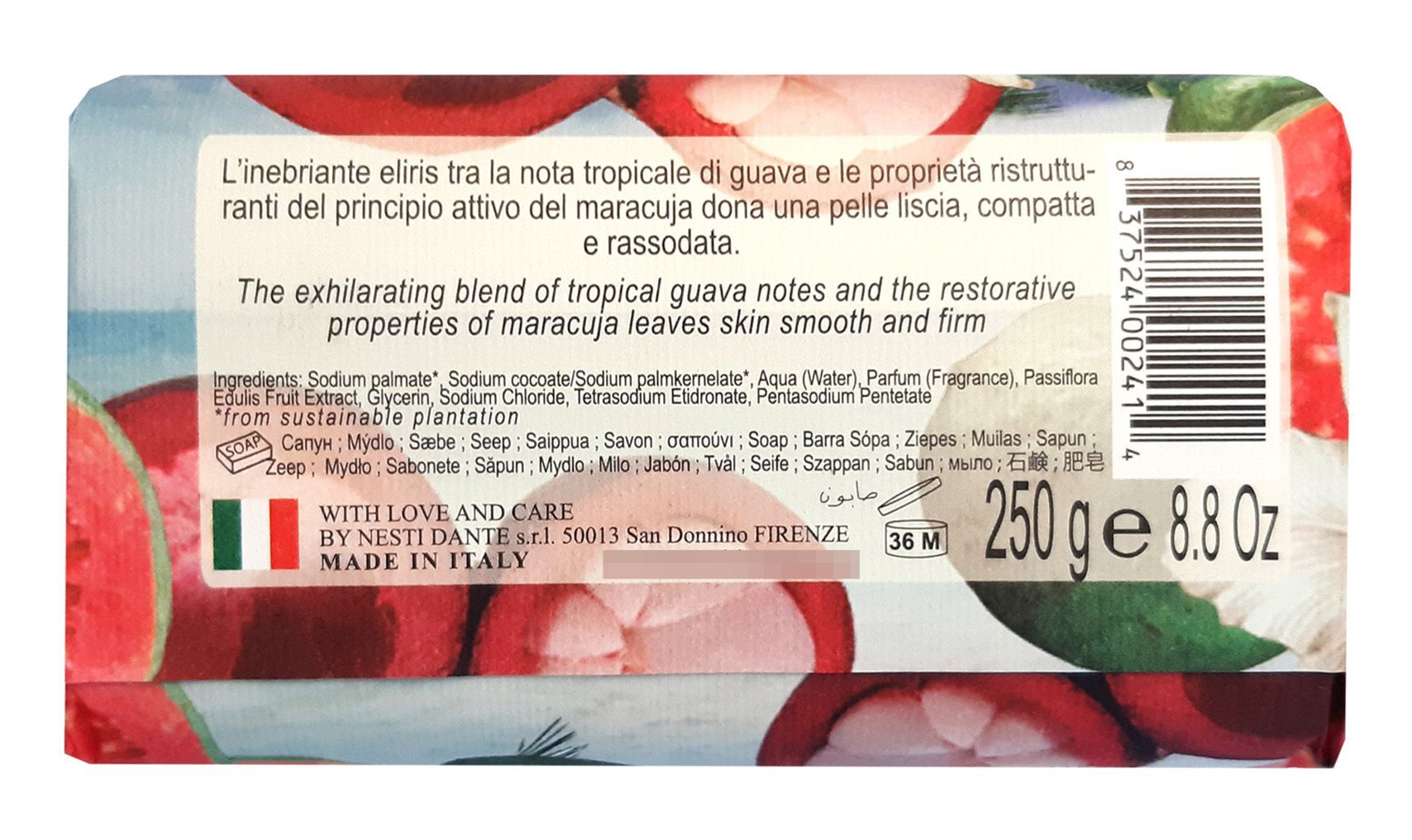 Натуральное растительное мыло Nesti Dante «Paradiso Tropicale» изготовлено по старинным рецептам и по традиционной котловой технологии, в составе мыла только натуральные оливковое и пальмовое масло высочайшего качества, для ароматизации использованы органические эфирные масла. Ежедневный ритуал красоты, любви и заботы не только для тела, но и для души. Сочный аромат мыла «Гуава и маракуйя» закружит в вихре ярких эмоций и обеспечит хорошее настроение в течение всего дня. Эффект: укрепление кожи.