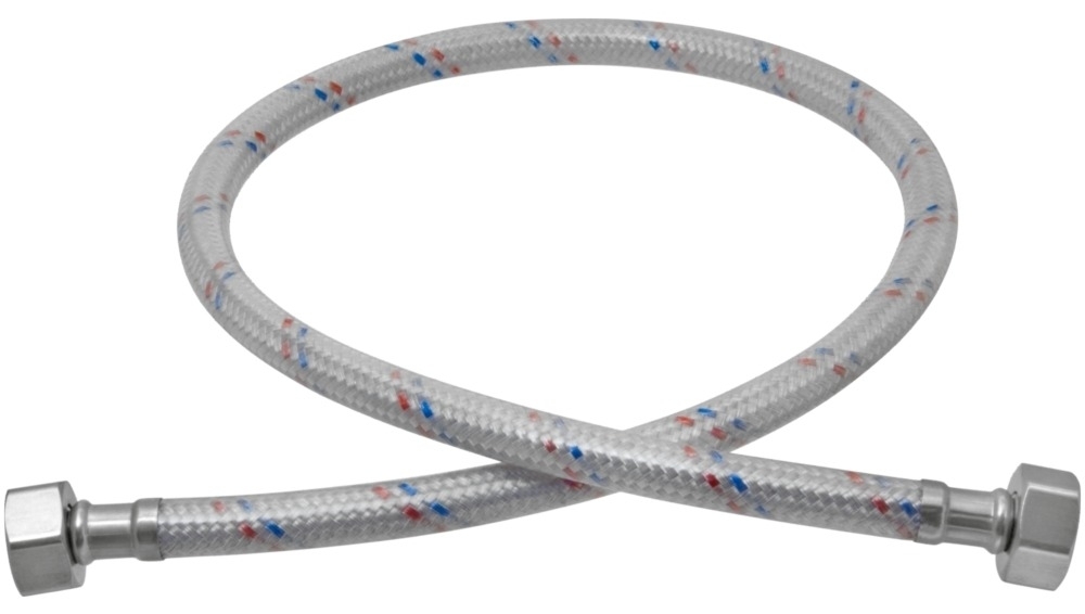 Гибкая подводка с двойным полимерным покрытием – предназначена для подключения сантехнического оборудования (смывных бачков, смесителей, водонагревателей, стиральных и посудомоечных машин) к трубопроводам системы гор/хол водоснабжения. Изделие представляет собой гибкий шланг, внутренняя трубка которого изготовлена из этилен-пропиленового каучука (EPDM), покрытого оплеткой из нейлона с поливинилхлоридным (ПВХ) покрытием. Накидная гайка и обжимные гильзы выполнены из нержавеющей стали, а штуцер и ниппель из латуни. На оплетке гибкой подводки нанесены маркеры синего и красного цвета, что свидетельствует об универсальности изделия, т.е. гибкая подводка подходит как для горячей, так и для холодной воды. Данная подводка отличается своей высокой надежностью и долговечностью, подходит под любую среду эксплуатации, в том числе с повышенной влажностью. Материал, используемый в оплетке, блокирует блуждающие токи и не подвержен коррозии. Двойное полимерное покрытие увеличивает механическую стойкость подводки. Недопустимо использование гибкой подводки для применения в постоянном проточном режиме (вместо трубопровода). Радиус изгиба при установке не должен быть менее 70 мм.