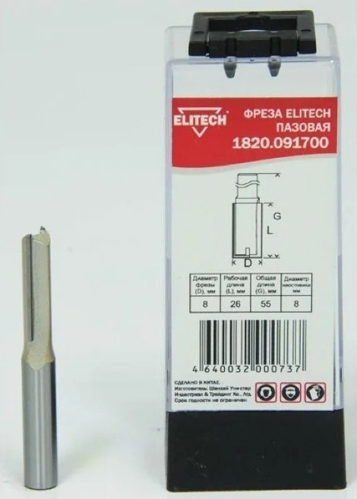 Фреза Elitech / Элитек пазовая прямая удлиненная, 2 лезвия, стальная, диаметр 8мм, хвостовик 8мм, 25.4/55мм / инструменты