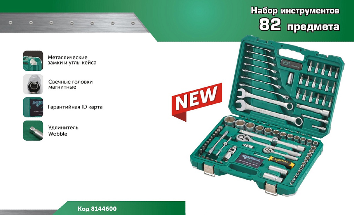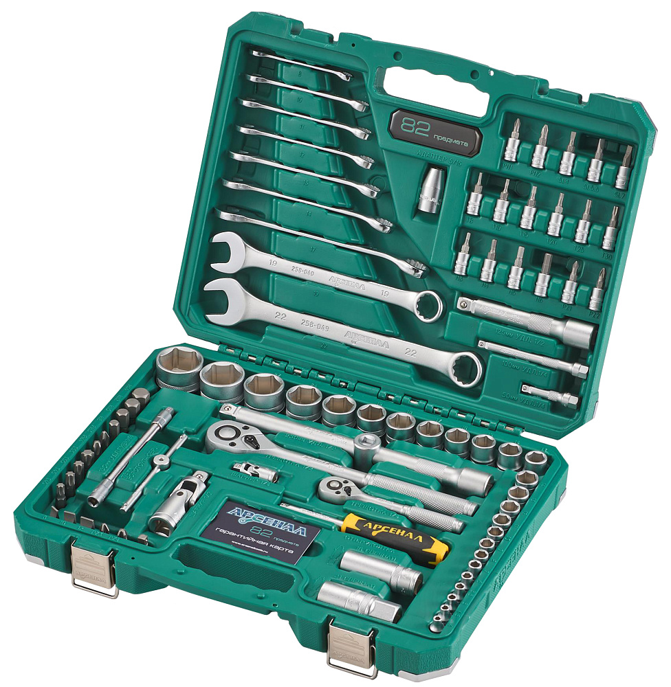 Набор автомобильного инструмента Арсенал — это профессиональный набор автоинструментов, включающий в себя 82 предмета и предлагает автолюбителю все необходимое для самостоятельного и полноценного ремонта легкового автомобиля (универсальное сочетание торцевых головок и комбинированных ключей).
