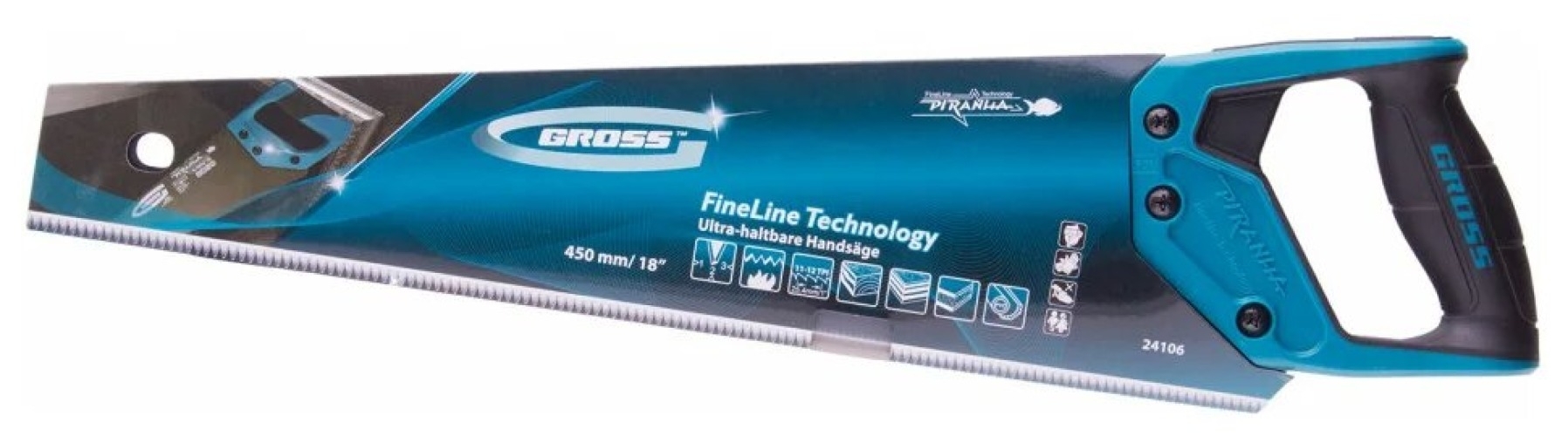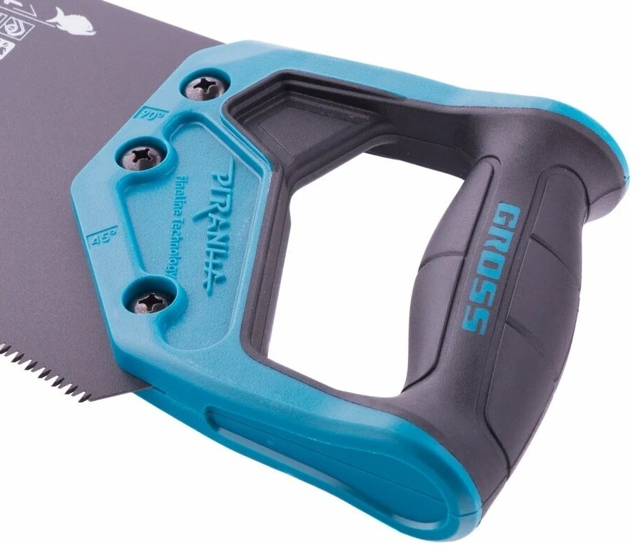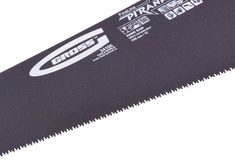 Ножовка по дереву 450 мм GROSS PIRANHA 24106 оснащена высококачественным полотном и выполняет чистое и быстрое пиление. Благодаря лазерной 3-D заточке зубья долго остаются острыми. На полотно ножовки нанесено тефлоновое покрытие для снижения трения и защиты от коррозии.