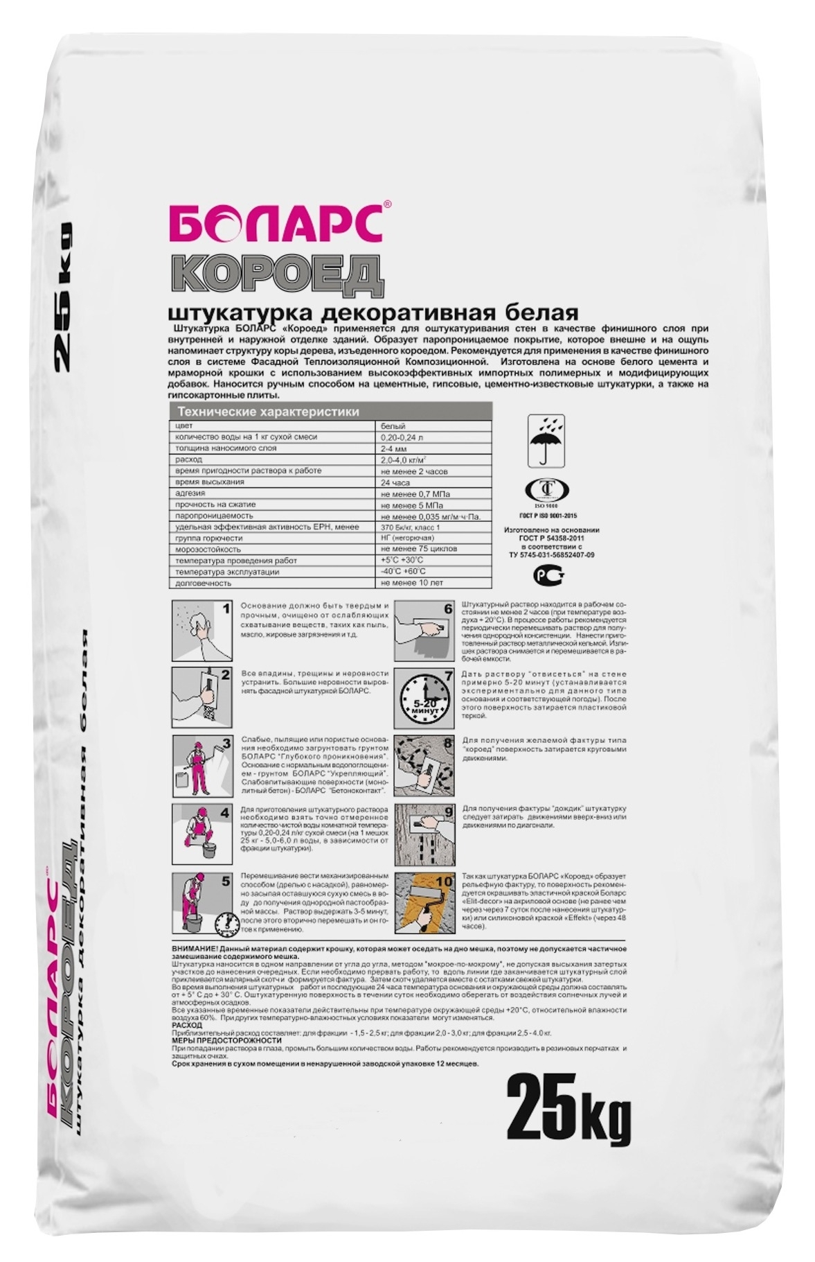 Такие качества, как повышенная морозостойкость, и широкий диапазон температур делают декоративную штукатурку Боларс незаменимой для российских условий. Сниженный расход и долгий срок службы, к тому же, делают применение структурных штукатурных смесей Боларс экономически выгодным.