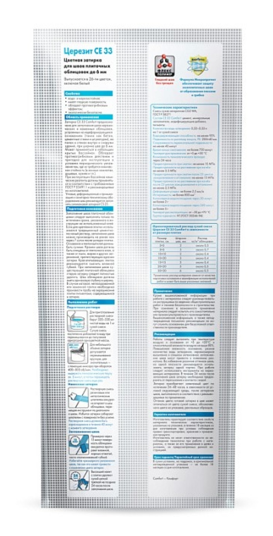 Затирка Ceresit СЕ33 Comfort предназначена для заполнения швов керамических и каменных облицовок, устроенных на недеформирующихся основаниях (таких как бетон, цементные стяжки и штукатурки), на полах и стенах внутри и снаружи зданий, при ширине шва до 6 мм.