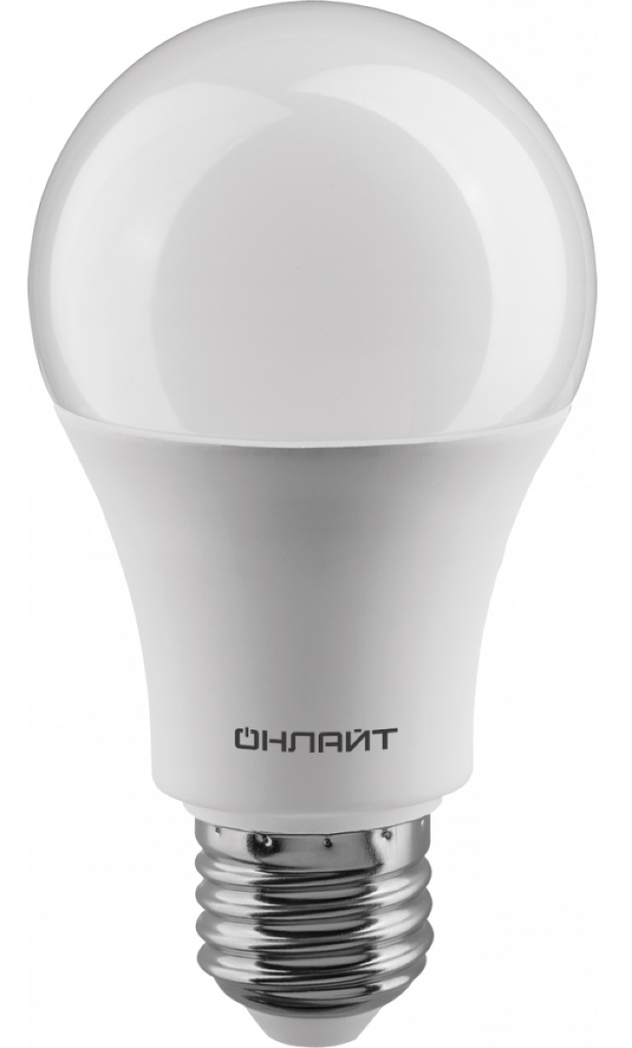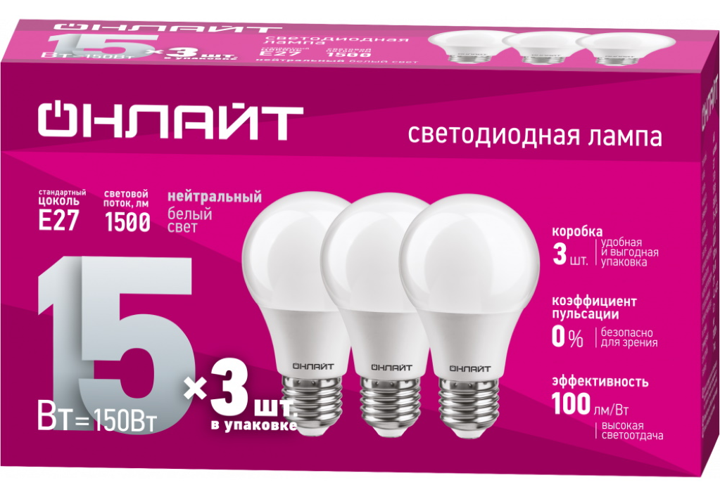 Лампочка светодиодная ОНЛАЙТ OLL-A60-15-230-4K-E27-PACK3 реализуется в индивидуальной упаковке.