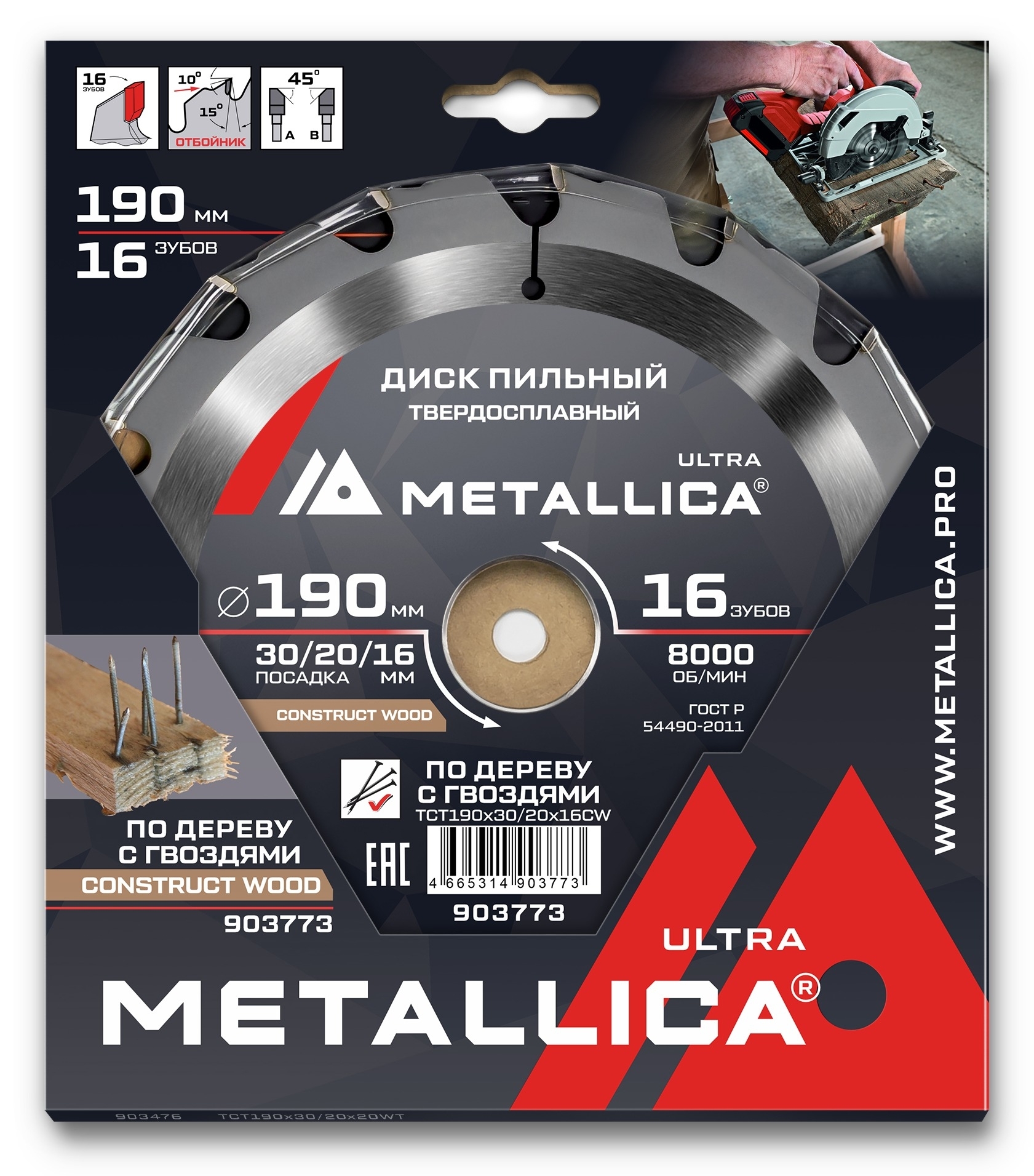 Диск пильный Metallica / Металлика Ultra по дереву, твердосплавный, зубья 16шт., диаметр 190мм, посадочный 30мм / расходные материалы и оснастка
