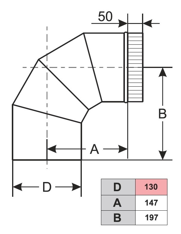 Используется для изменения направления дымового канала. Из нержавеющей стали AISI 430 толщиной 0,5 мм используются для дымоотводящих систем с начальной температурой исходящих газов до 300°C (рекомендованы для газовых котлов).