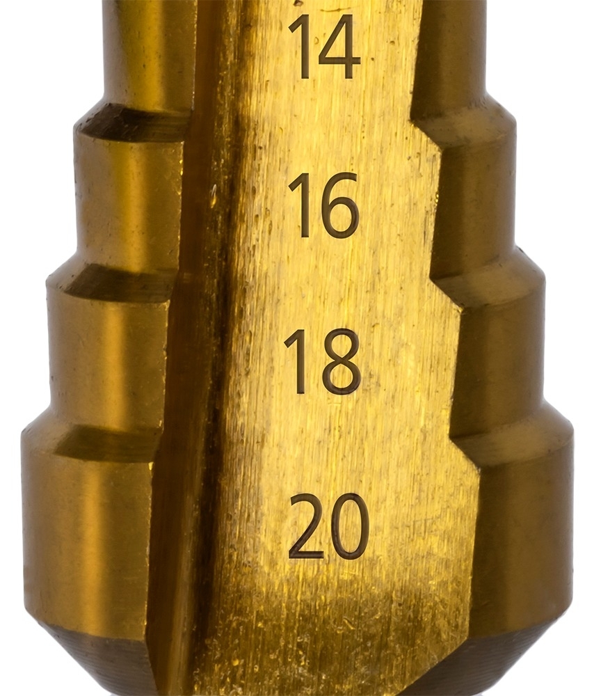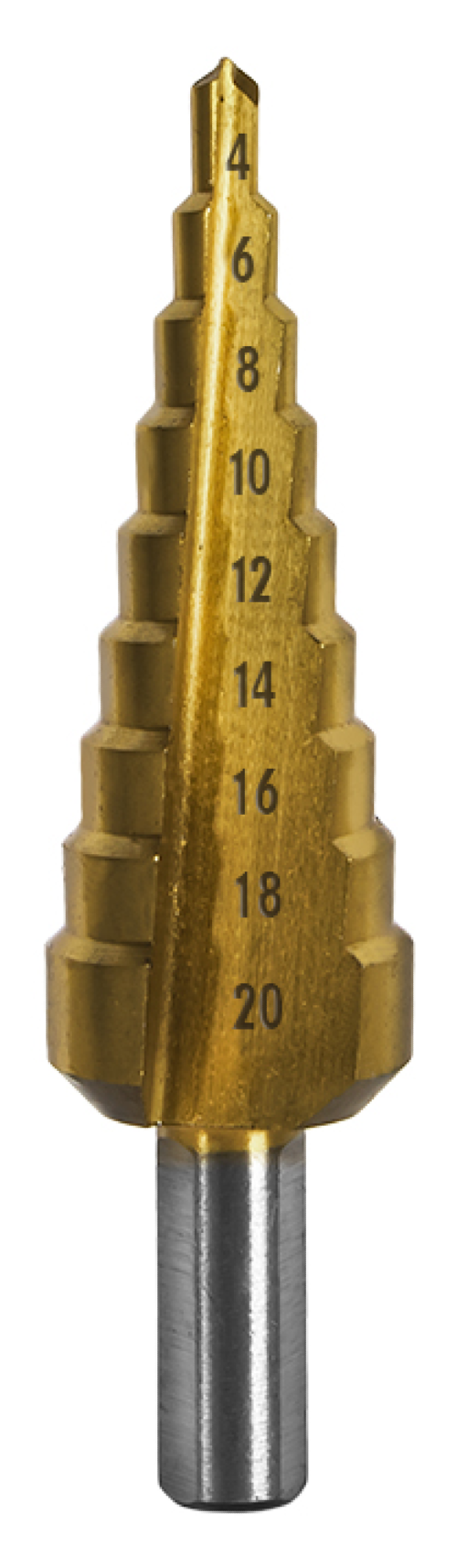 Сверло по металлу ступенчатое 4-20мм, шаг 2мм,TIN Р6М5 хв.3-х гр ПРОФИ предназначено для сверления отверстий в листовых металлических и пластиковых материалах. Поверхностное упрочнение нитридом натрия увеличивает ресурс сверла.