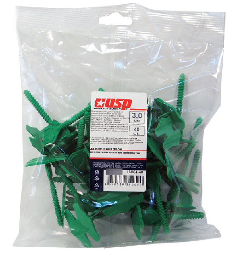 Зажим для выравнивания плитки USP винтовой, пластиковый, зеленый, 3мм, 40шт. - 1шт.