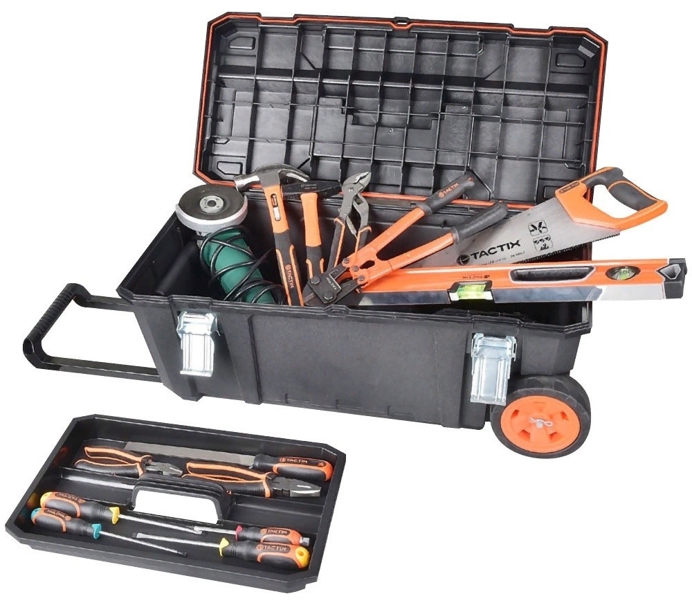 - Кейс-тележка для инструментов Tactix, арт. 320394, серии PRO изготовлен из очень прочного материала, который гарантирует долговечность конструкции и устойчивость к механическим повреждениям;