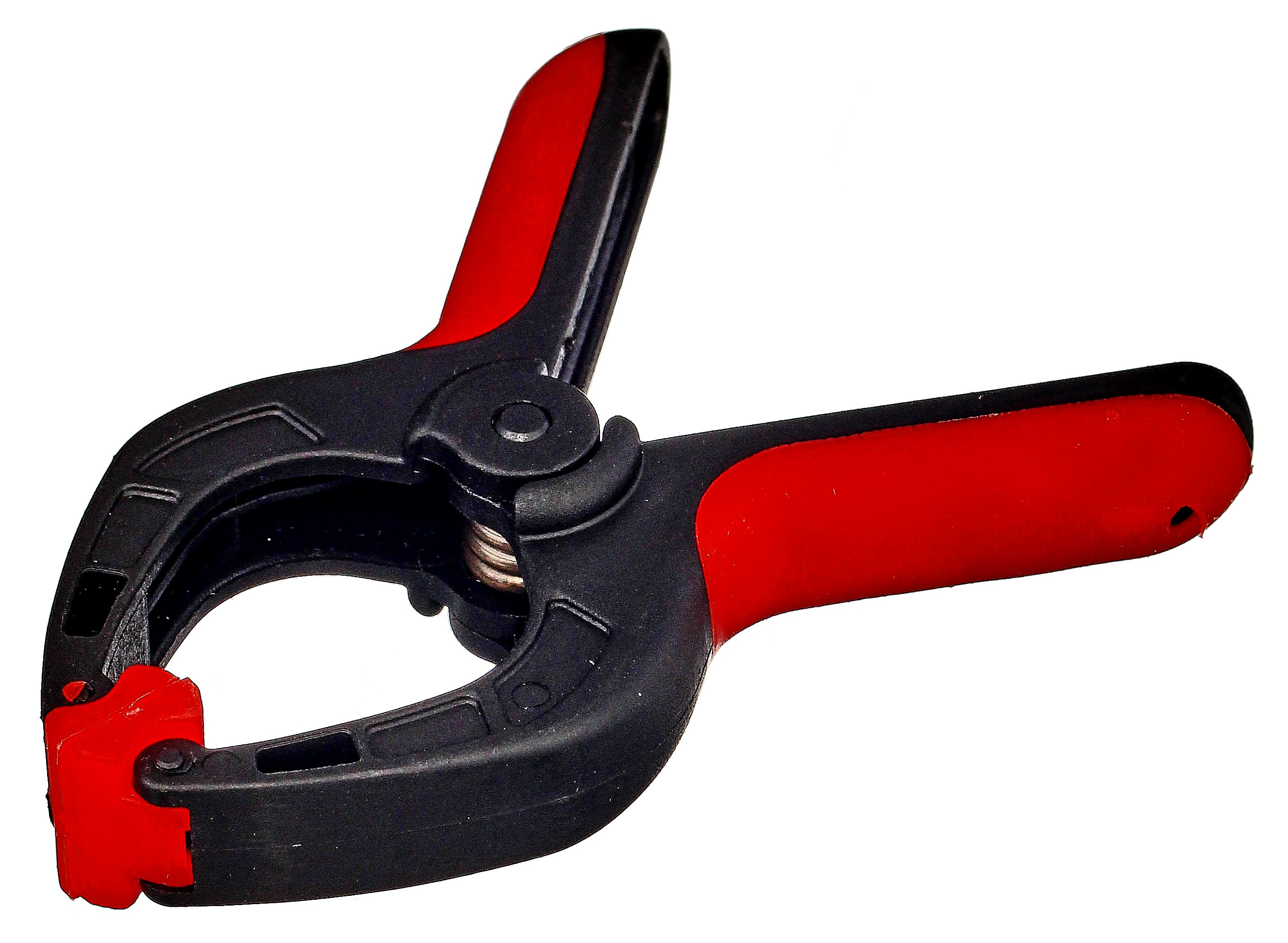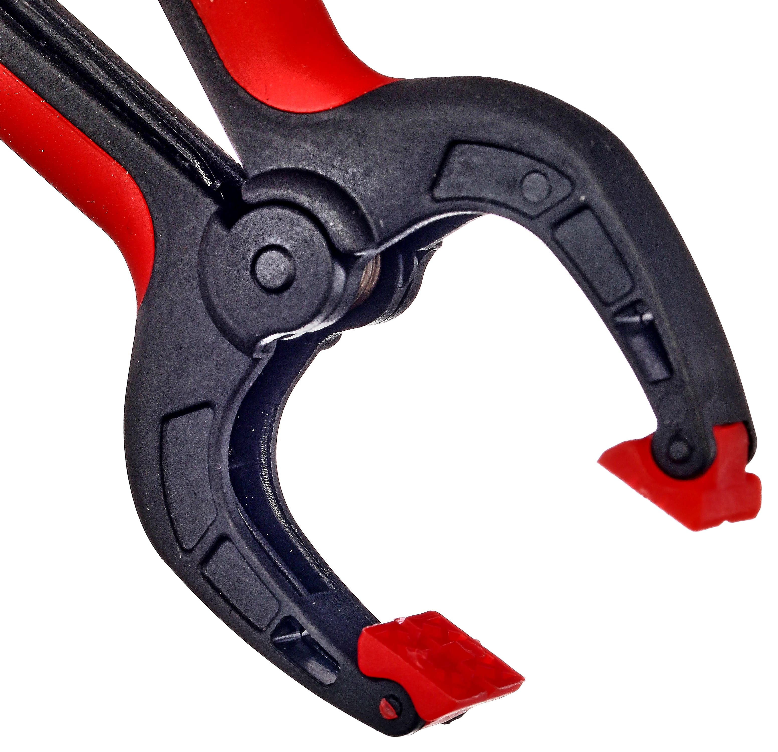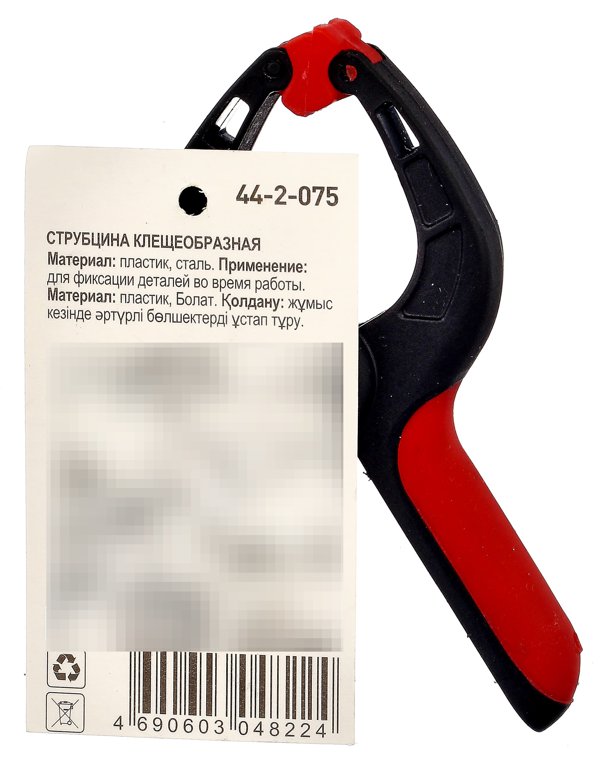 Корпус струбцины выполнен из пластика с резиновыми накладками. Пружина и крепежные элементы выполнены из стали. Служит для удержания различных деталей и заготовок во время работы. Храповой механизм обеспечивает надежную и жесткую фиксацию заготовок в отличие от механизма пружинных струбцин прищепочного типа. При нажатии на курок происходит мгновенное раскрытие струбцины.