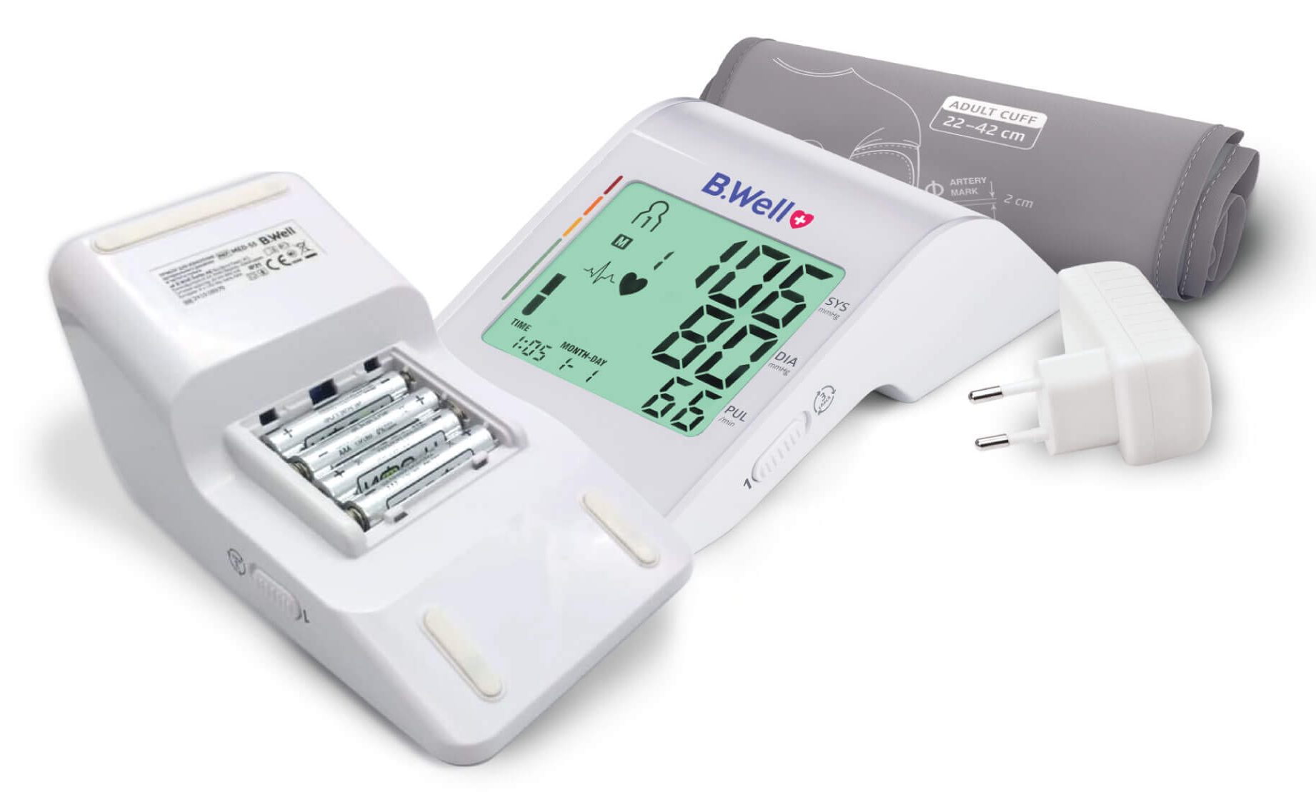 Тонометр B.Well MED-55 выделяется своими техническими характеристиками. Питание — 4 батарейки типа АА, сетевой адаптер.