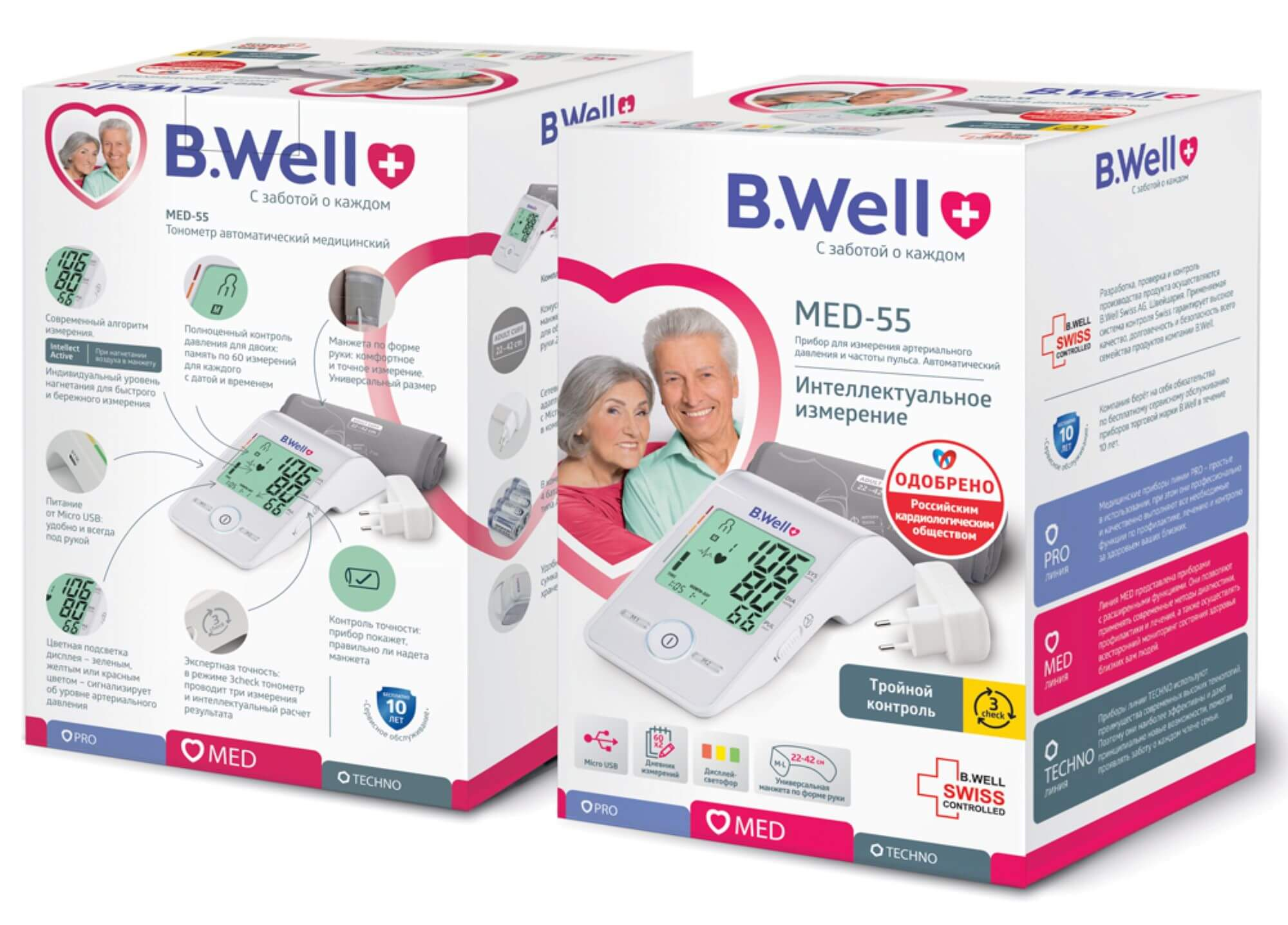 Тонометр для давления B.Well MED-55 реализуется в индивидуальной упаковке. Выполнен в пластиковом корпусе. Манжета — нейлон, пластик, металл. Цвет — белый. Манжета для рук с обхватом плеча от 22 до 42 см.