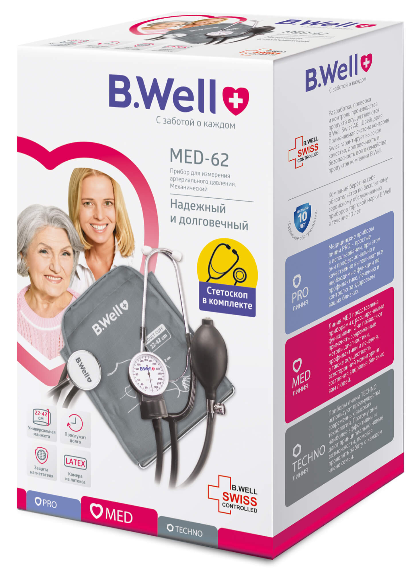 Тонометр для давления B.Well MED-62 реализуется в индивидуальной упаковке. Выполнен в пластиковом корпусе. Манжета — нейлон, пластик, металл. Цвет — серый. Манжета для рук с обхватом плеча от 22 до 42 см.