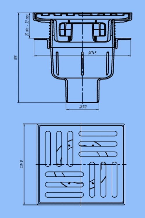Сухой трап вертикальный регулируемый, с выпуском 50 мм, металлическая решетка 15×15 см.