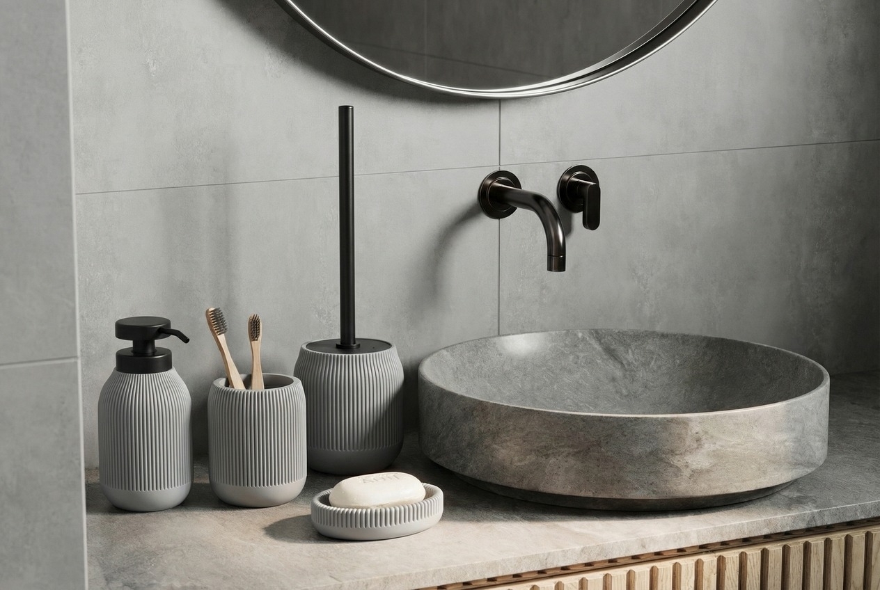 Современный минималистичный дизайн аккуратно дополняет интерьер ванной, сочетаясь с белыми, серыми и деревянными тонами.