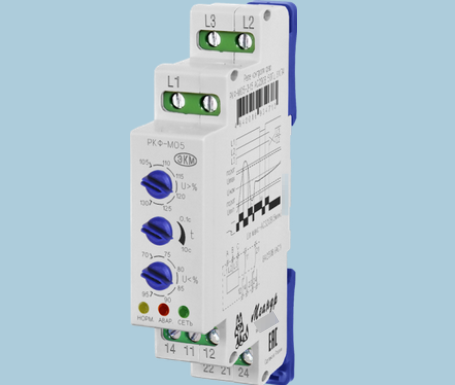 Реле контроля фаз РКФ-М05-1-15 предназначено для контроля параметров работы трехпроводных трехфазных сетей (трехфазных сетей без нейтрали), а так же защиты оборудования от работы на пониженном или повышенном напряжении из-за неполадок в сети. Питание реле осуществляется от контролируемой цепи.